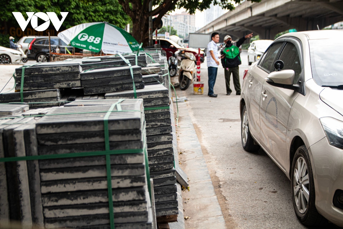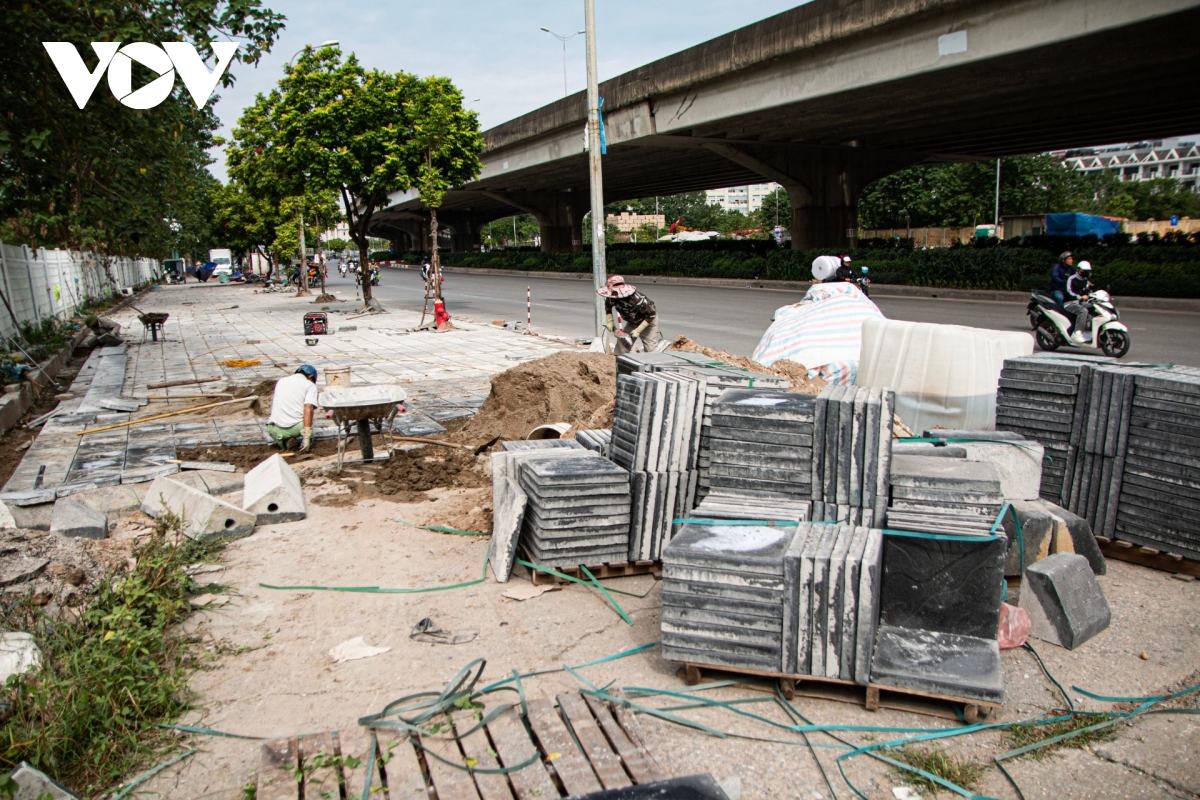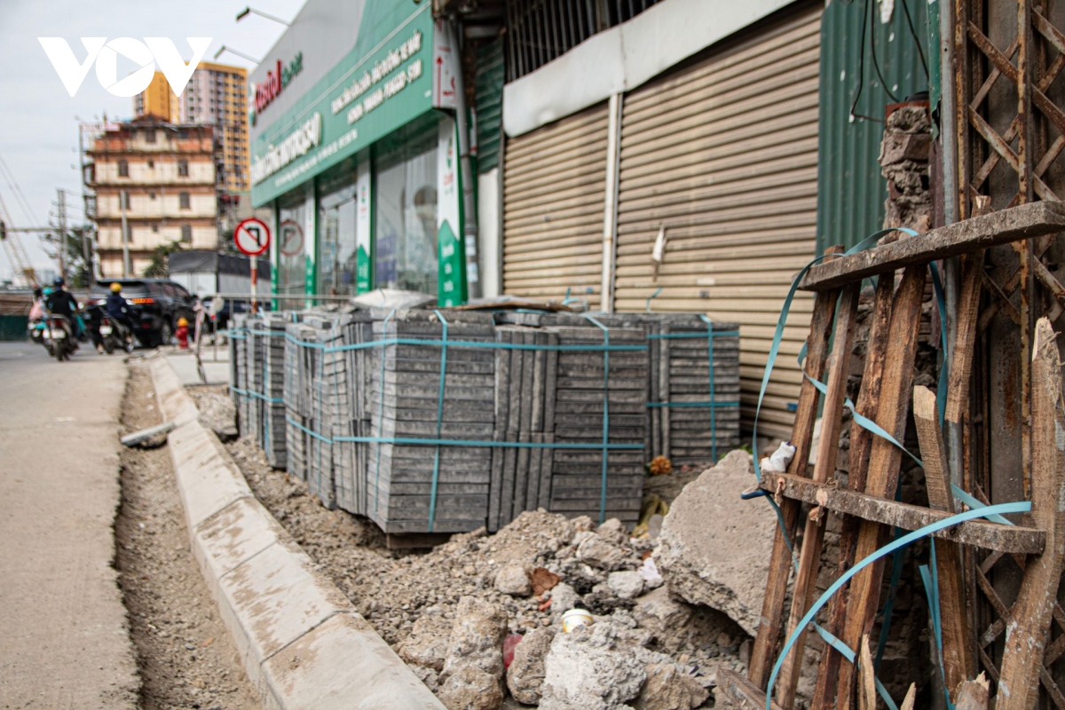 Nhiều đoạn vỉa hè đã được hoàn thiện, song, nguyên vật liệu như cát, xi măng, đá,... vẫn còn tập kết ngổn ngang, bừa bãi gây cản trở lối đi của người đi bộ và mất mĩ quan đô thị.