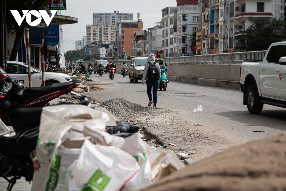 Trên trục đường Kim Đồng giao với đường Giải Phóng, cát sỏi từ các công trình thi công nằm ngổn ngang, vỉa hè cũng đang trong quá trình trùng tu, cải tạo. Nhiều đoạn bị rào chắn, mặt đường gồ ghề khiến người đi bộ buộc phải đi xuống lòng đường.