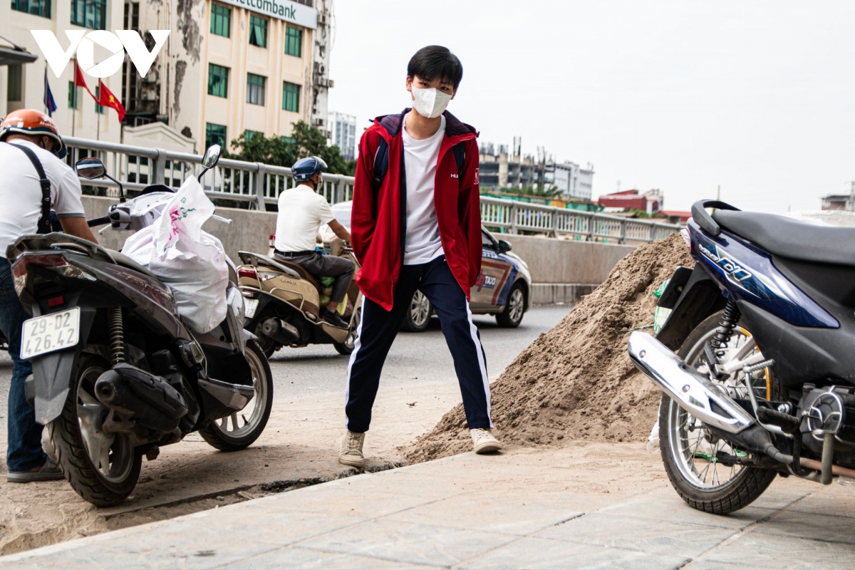 Dọc hai bên tuyến đường Khuất Duy Tiến, từ nút giao Nguyễn Trãi đến khu đô thị Kim Văn – Kim Lũ, vỉa hè đang được bóc lên để lát đá mới. Nhiều nhóm công nhân cùng máy móc làm việc liên tục suốt ngày, tạo nên khung cảnh tấp nập nhưng cũng kéo theo không ít phiền toái: giao thông bị ảnh hưởng, việc kinh doanh của người dân gặp khó, người đi bộ phải len lỏi giữa những đống vật liệu ngổn ngang. Đặc biệt, trong tiết giao mùa hanh khô, gió thổi mạnh khiến cát, bụi bay mù mịt, gây ô nhiễm không khí và ảnh hưởng trực tiếp đến đời sống của các hộ dân xung quanh.