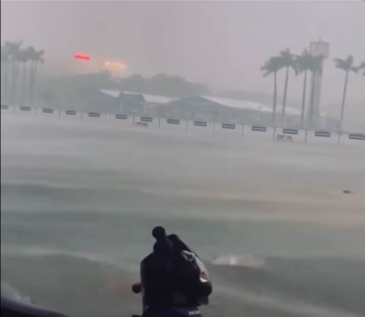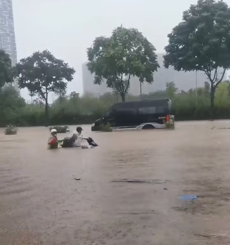 Khu vực Mỹ Đình mưa to kèm gió lớn tạo thành những cơn sóng, các phương tiện hiện không thể di chuyển qua. Ảnh: MXH