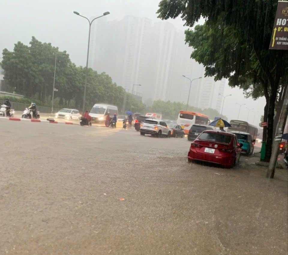 Trần Duy Hưng - Đại lộ Thăng Long - Khuất Duy Tiến nước ngập qua cửa xe. Phương tiện chết máy và không thể di chuyển. Ảnh: Ngọc Linh