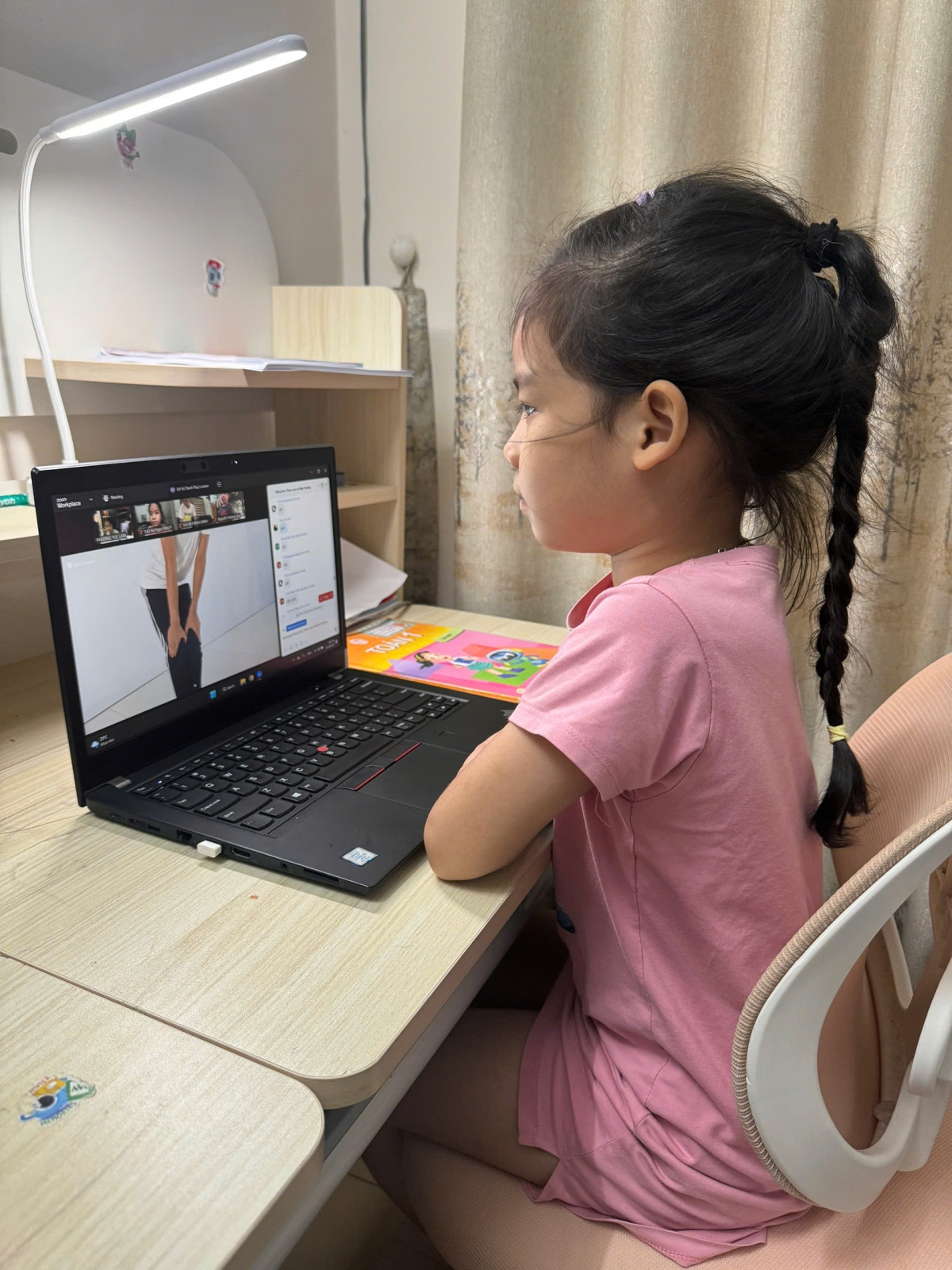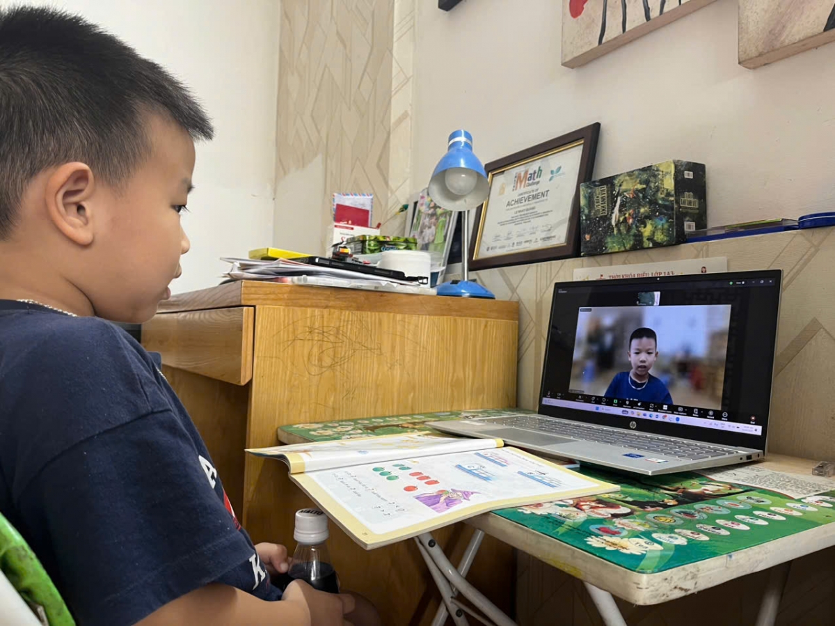 Học sinh Trường Tiểu học Thanh Xuân Nam học online tại nhà do ảnh hưởng của mưa lớn sáng 7/10.
