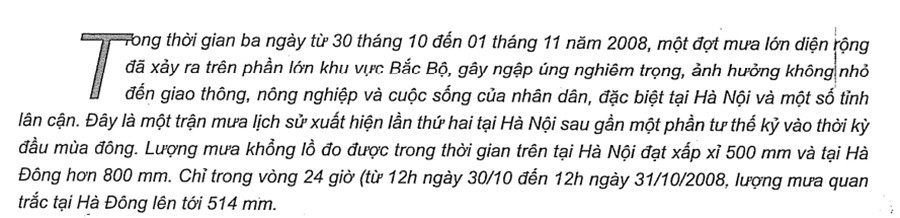 Còn theo Tạp chí KTTV thì trong 24 giờ (từ 12h ngày 30/10 đến 12h ngày 31/10/2008), lượng mưa quan trắc tại Hà Đông lên tới 514 mm.