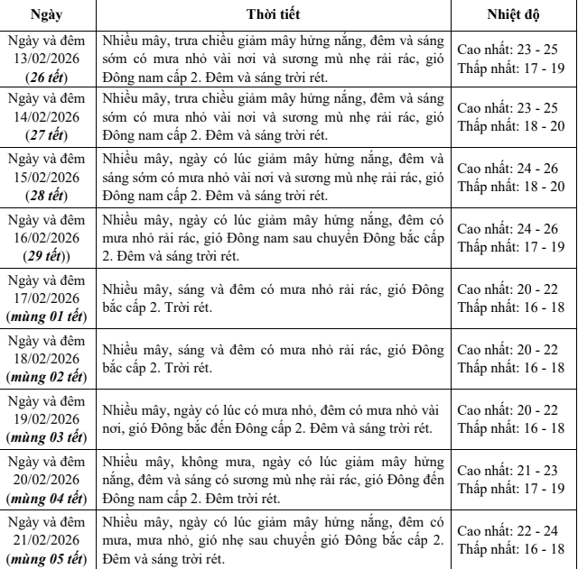 Đài Khí tượng thủy văn Bắc Bộ cho biết, từ ngày 13 đến ngày 16-2 (tức từ ngày 26 đến ngày 29 tháng Chạp), do ảnh hưởng của áp cao lạnh lục địa suy yếu và dịch chuyển sang phía Đông, thời tiết Hà Nội nhiều mây, trưa và chiều có lúc giảm mây hửng nắng. Đêm và sáng sớm có mưa nhỏ vài nơi, sương mù nhẹ rải rác; gió Đông Nam cấp 2, đêm và sáng trời rét. Nhiệt độ cao nhất phổ biến 23-26 độ C, thấp nhất 17-20 độ C.