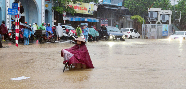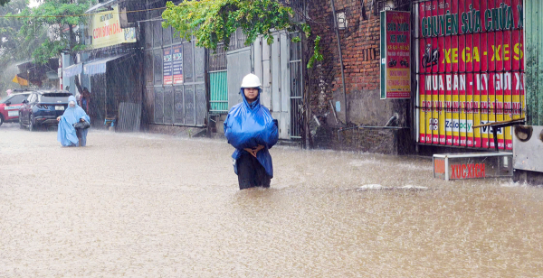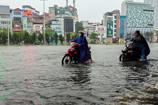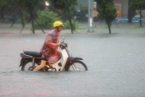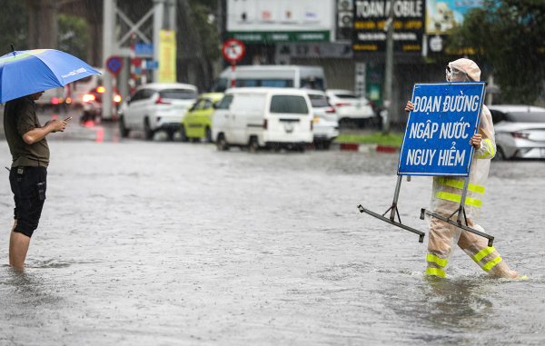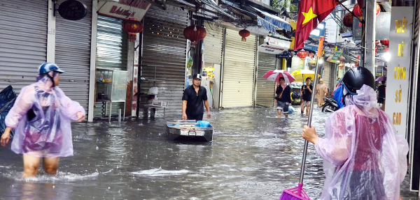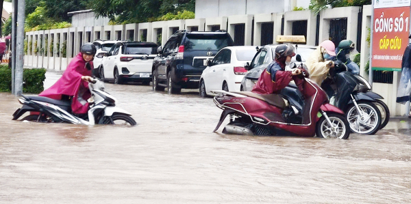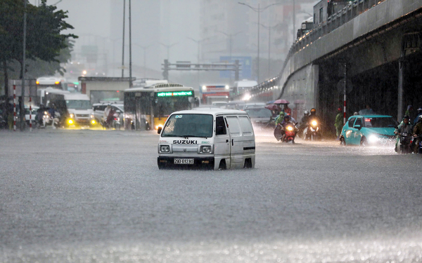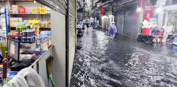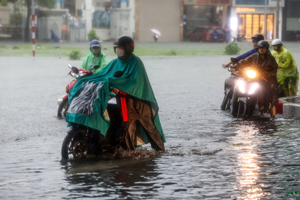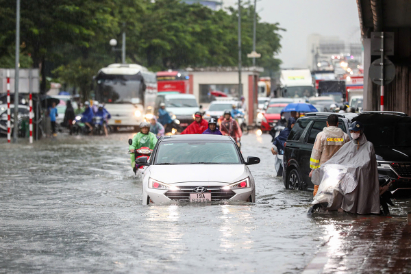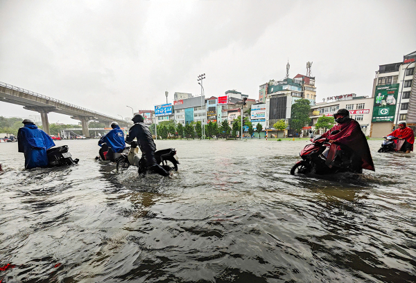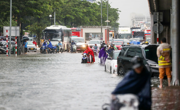 Tính đến đầu giờ sáng nay, Công ty Thoát nước Hà Nội ghi nhận, tại khu vực trung tâm có khoảng 30 điểm ngập úng. Trời Hà Nội tối sầm, các tuyến đường ngập sâu, giao thông ùn ứ.