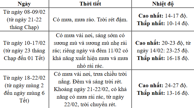 Các nơi còn lại ở miền Bắc, ngày 8 và 9-2 trời rét đậm, vùng núi có nơi rét hại. Bắc miền Trung từ ngày 8-2 trời rét, có nơi rét đậm. Nhiệt độ thấp nhất trong đợt không khí lạnh này ở miền Bắc phổ biến 10-13 độ C, vùng núi 7-10 độ C, vùng núi cao có nơi dưới 3 độ C; Bắc miền Trung phổ biến 12-15 độ C. Vùng núi cao miền Bắc cần đề phòng khả năng xảy ra băng giá và mưa tuyết.