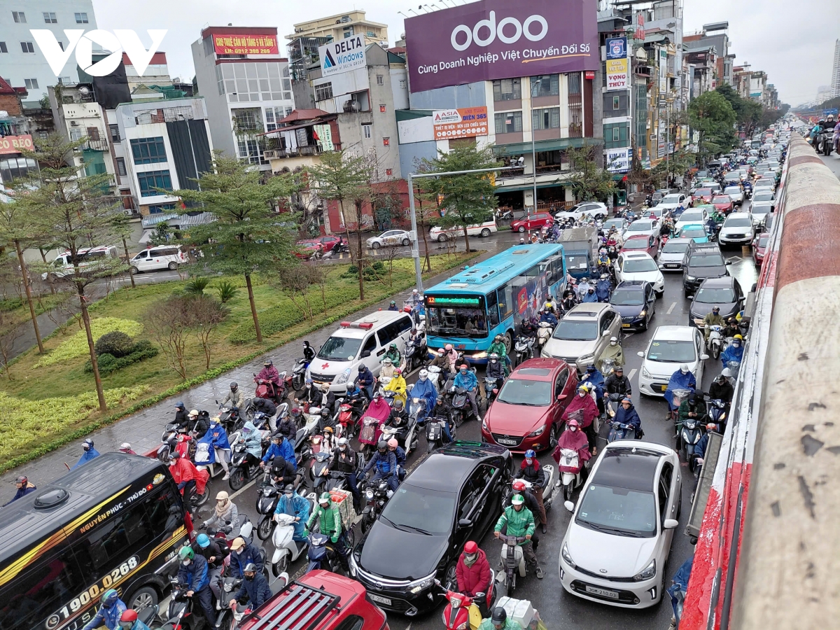 Cầu vượt ngã tư Vọng làn đường phía dưới ùn tắc kéo dài, người dân chật vật di chuyển qua ngã tư, phía trên cầu các phương tiện di chuyển dễ hơn.