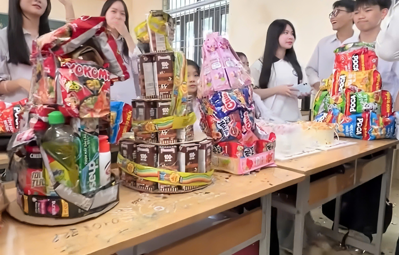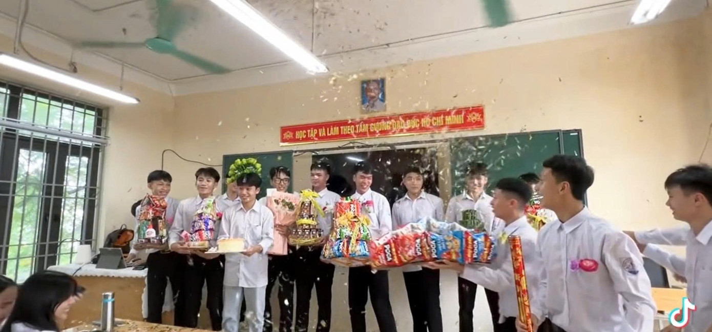 Khi đoàn “bê quà” tiến vào lớp học, những tràng pháo giấy tung bay, tiếng reo hò và nụ cười rạng rỡ đã tạo nên một khoảnh khắc vô cùng ngộ nghĩnh. Bàn học nhanh chóng được lấp đầy bởi những bông hoa nhỏ xinh, tháp bánh, kẹo được các bạn nam kỳ công chuẩn bị. Không cần những món quà đắt tiền, các bạn học sinh trong đoạn clip trên đã thể hiện tinh thần đoàn kết, sáng tạo và biết trân trọng những người phụ nữ xung quanh mình theo cách riêng, đúng với phong cách trong sáng, tinh nghịch của tuổi học trò.