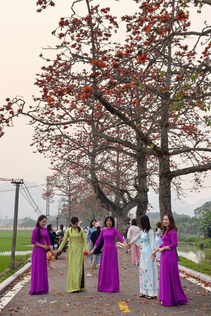 Hàng cây hoa gạo tại thôn Đoan Nữ nằm dọc theo con đường dẫn vào khu nghĩa trang, chạy song song với hệ thống kênh thủy lợi và cánh đồng lúa xanh mướt. Đây là thời điểm hoa nở rộ nhất, khi cây đã trút sạch lá để nhường chỗ cho những bông hoa 5 cánh dày, mang sắc đỏ tươi đồng nhất trên nền trời.