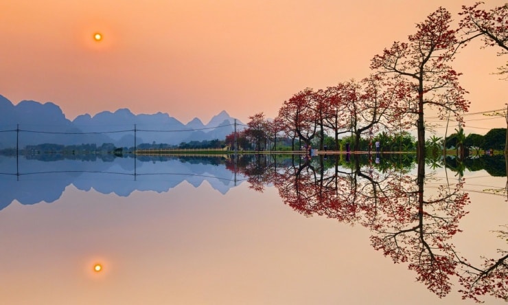 Hàng hoa gạo cổ thụ soi bóng bên dòng kênh tạo nên cảnh quan yên bình tại thôn Đoan Nữ.