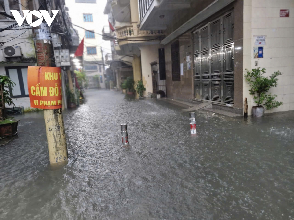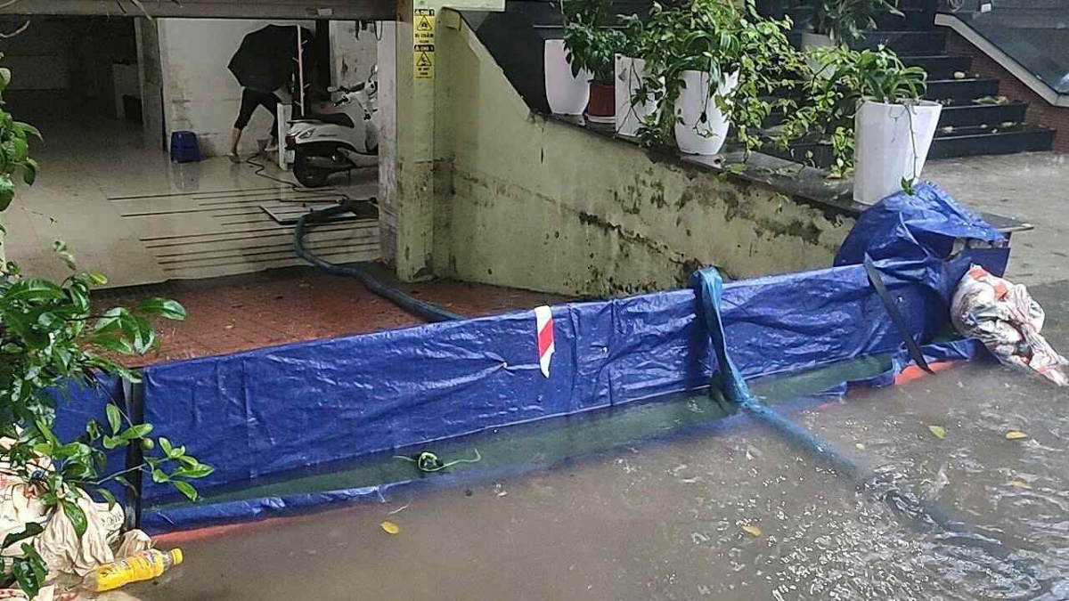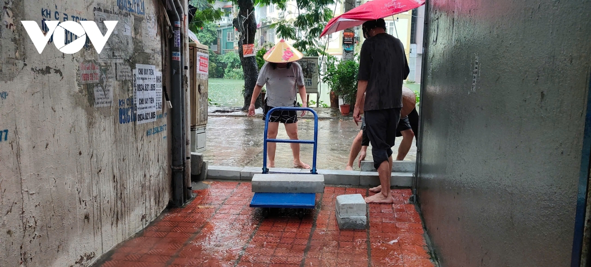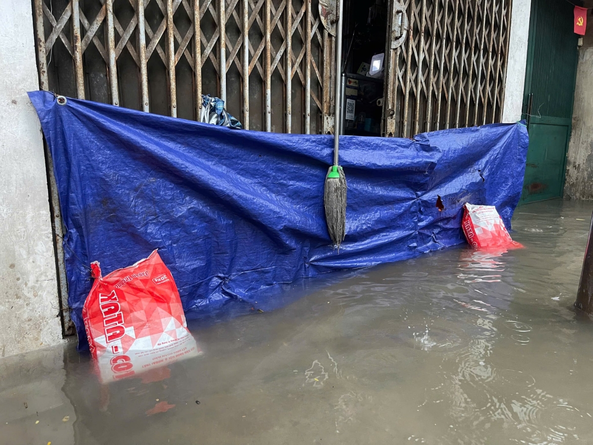 Tại một số tuyến phố như Quan Nhân, Nhân Hòa (phường Thanh Xuân), nhiều hộ dân đã chủ động dựng rào chắn nước, căng bạt ngăn nước mưa tràn vào nhà. Chị Đoàn Thúy Lan, sinh sống tại số 193 Quan Nhân, cho biết gia đình có cửa hàng kinh doanh sắt thép nên rất lo ngại khi mưa lớn kéo dài: “Khu này cứ mưa to là ngập. Cũng may hôm qua thấy dự báo Hà Nội sẽ có mưa lớn trong hai ngày 6 – 7/10 nên chúng tôi đã chuẩn bị sẵn bạt phủ, chặn nước trước cửa và kê cao những đồ thiết yếu. Không thể ngăn hết nhưng ít nhất cũng hạn chế ngập sâu như mọi khi”.