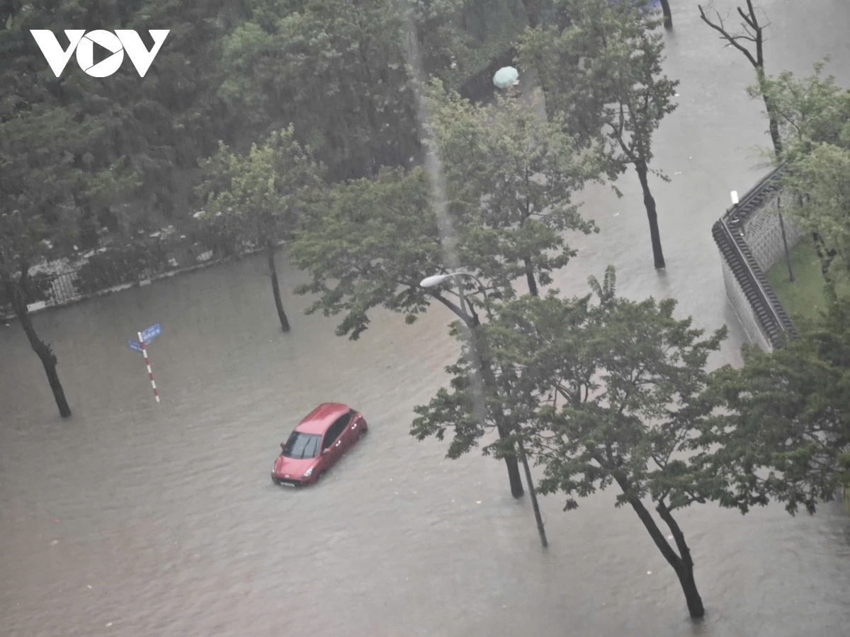 Cơn mưa lớn kéo dài suốt đêm qua đến sáng nay đã khiến khu Ngoại giao đoàn ngập sâu trong nước, nhiều tuyến đường biến thành “biển nước” mênh mông. Các phương tiện di chuyển khó khăn, nhiều xe gần như phải “bơi” giữa dòng nước ngập.