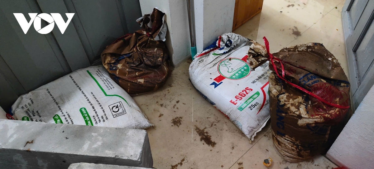 Rồi đến bao tải cát, bạt cũng được người dân tận dụng để chống nước vào nhà