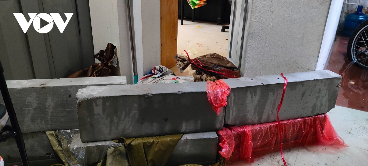 Những khối bê tông cũng được người dân tận dụng như “hàng rào tạm” nhằm ngăn nước tràn, hạn chế ngập sâu.