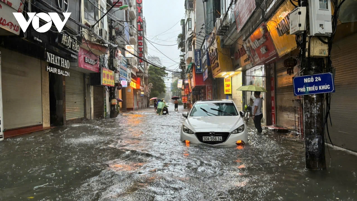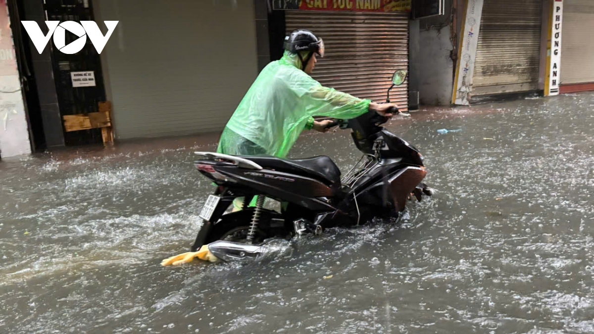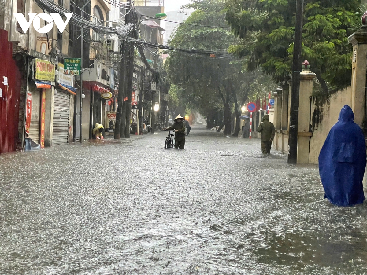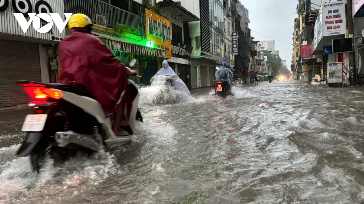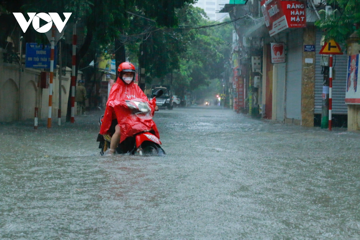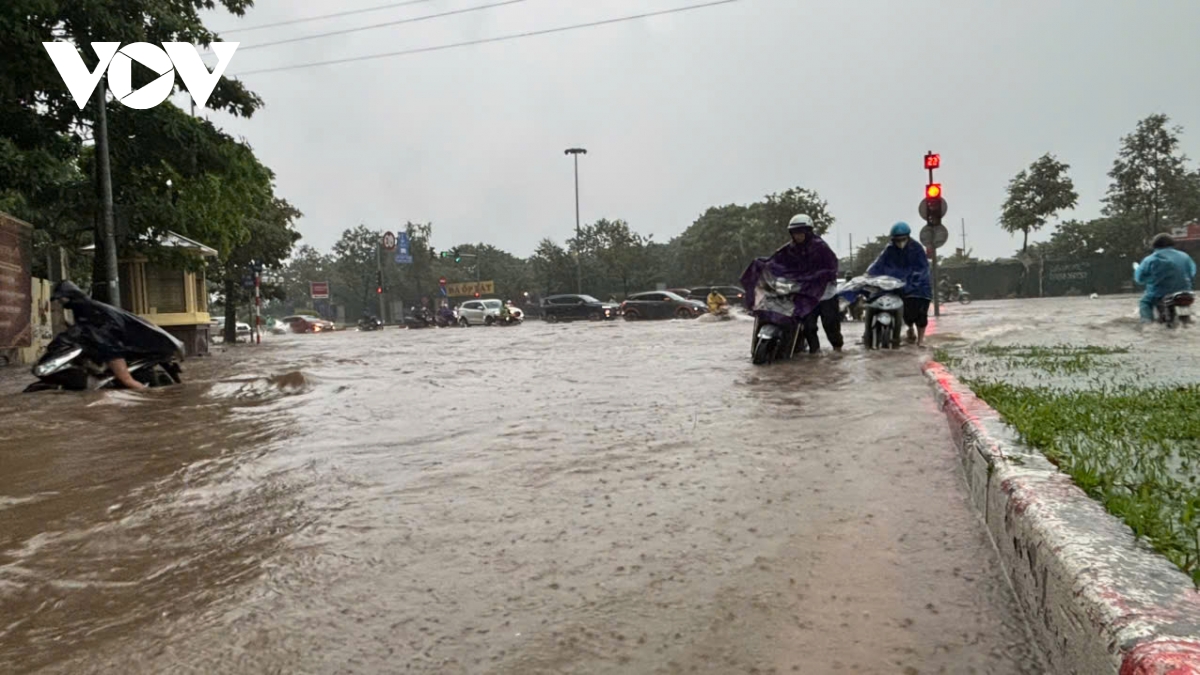 Ghi nhận tại phố Triều Khúc, nước dâng cao khoảng 80 cm, khiến việc di chuyển qua khu vực này hết sức khó khăn. Nhiều phương tiện bị chết máy, người dân phải dắt bộ giữa dòng nước ngập.