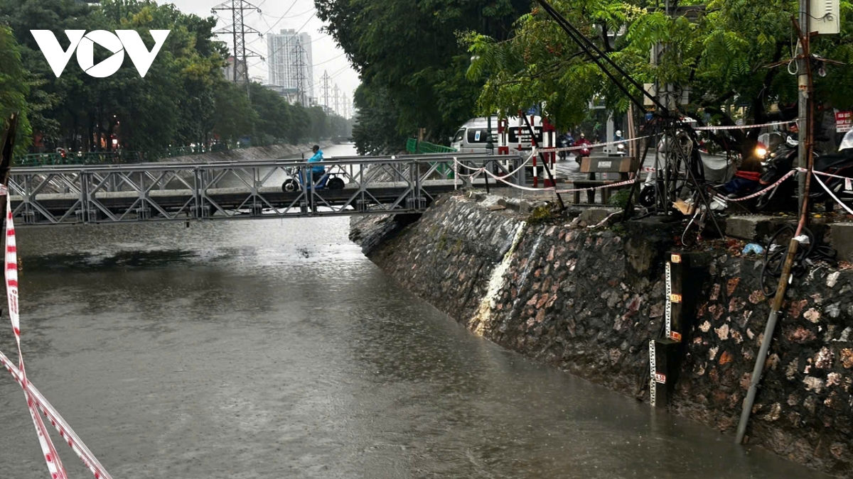 Lúc 8h15 sáng, mực nước sông Kim Ngưu - một trong những tuyến sông tiêu thoát chính của Hà Nội, được ghi nhận tại cầu S2 đạt 4,10 m.