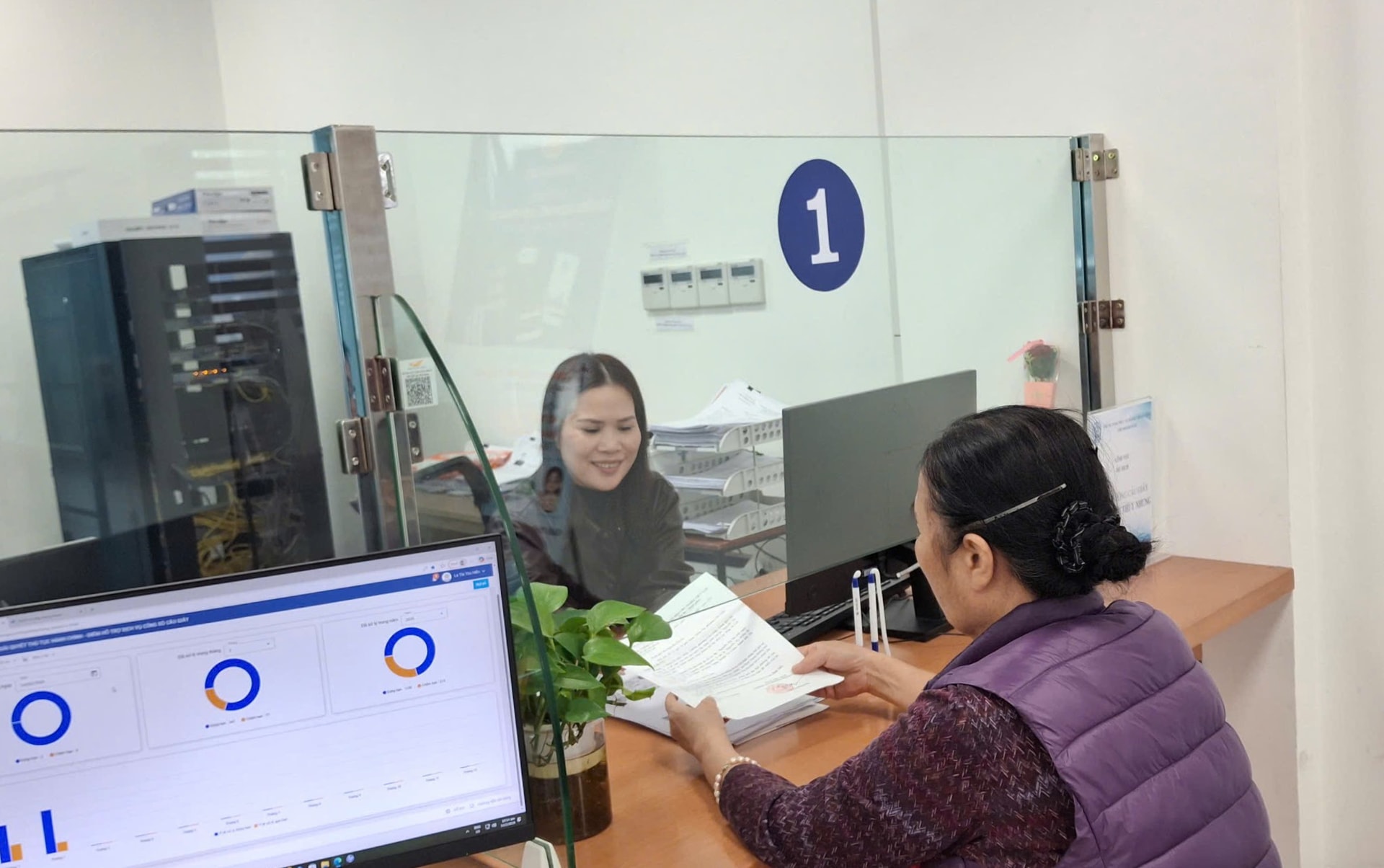 Chuyên viên chị Nguyễn Thị Thúy Nhung tận tình hỗ trợ bà Nguyễn Thị Hà hoàn thiện hồ sơ. Ảnh: Hiền Chi