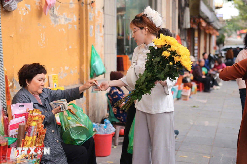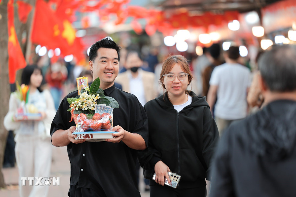 Những lễ vật đầu năm theo bước chân người đi lễ, mang theo ước vọng bình an và may mắn. (Ảnh: Phạm Tuấn Anh/TTXVN)