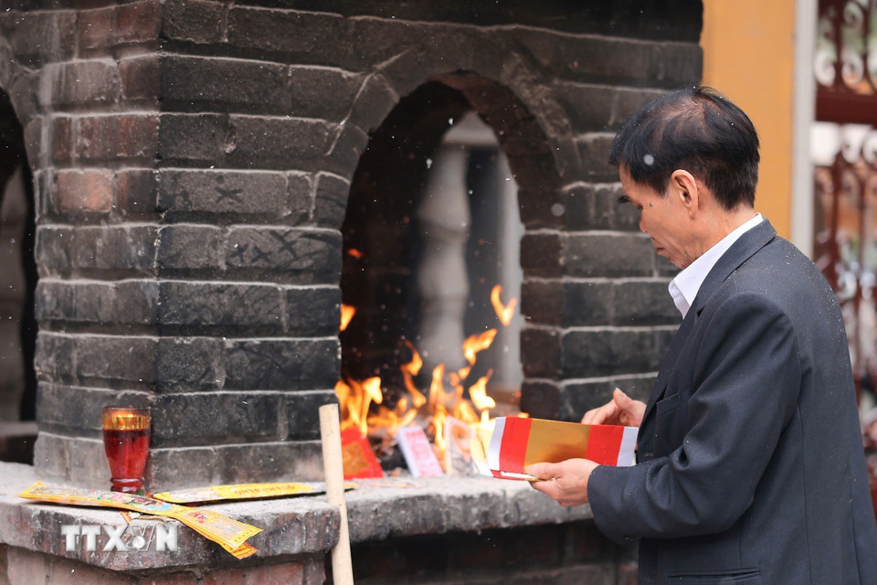 Người dân hóa vàng mã, gửi gắm ước nguyện về một năm mới bình an, thuận lợi và nhiều may mắn. (Ảnh: Phạm Tuấn Anh/TTXVN)
