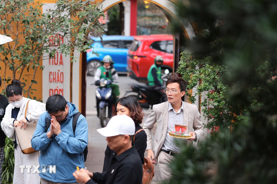 Người dân làm lễ cầu an trong dịp Rằm tháng Giêng tại chùa Quán Sứ. Vào những ngày đầu năm, nhiều người đến chùa dâng hương, chuẩn bị lễ vật và thành tâm khấn nguyện, mong một năm bình an, thuận lợi. (Ảnh: Phạm Tuấn Anh/TTXVN)