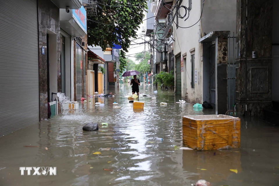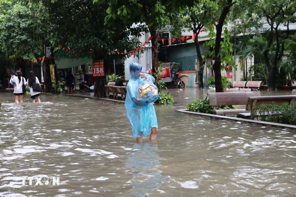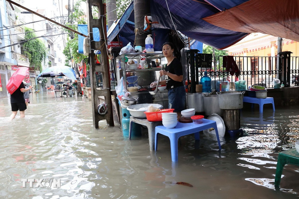 Mưa ngập khiến việc di chuyển, sinh hoạt của người dân gặp nhiều khó khăn. (Ảnh: Vũ Quang/TTXVN)