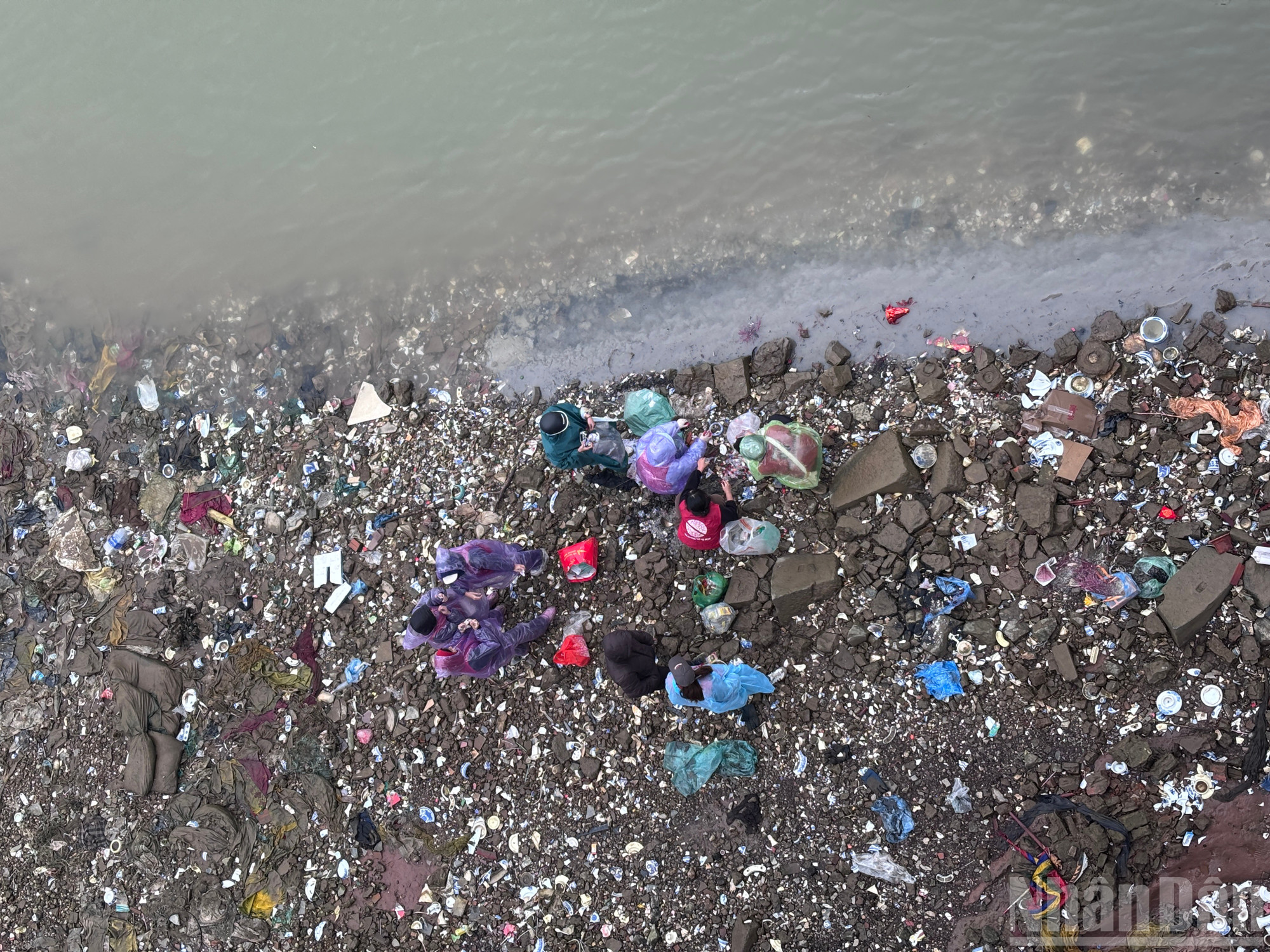 Ở phía dưới bờ sông Hồng, các bạn tình nguyện viên vẫn miệt mài thu gom và dọn dẹp rác thải, túi nylon.