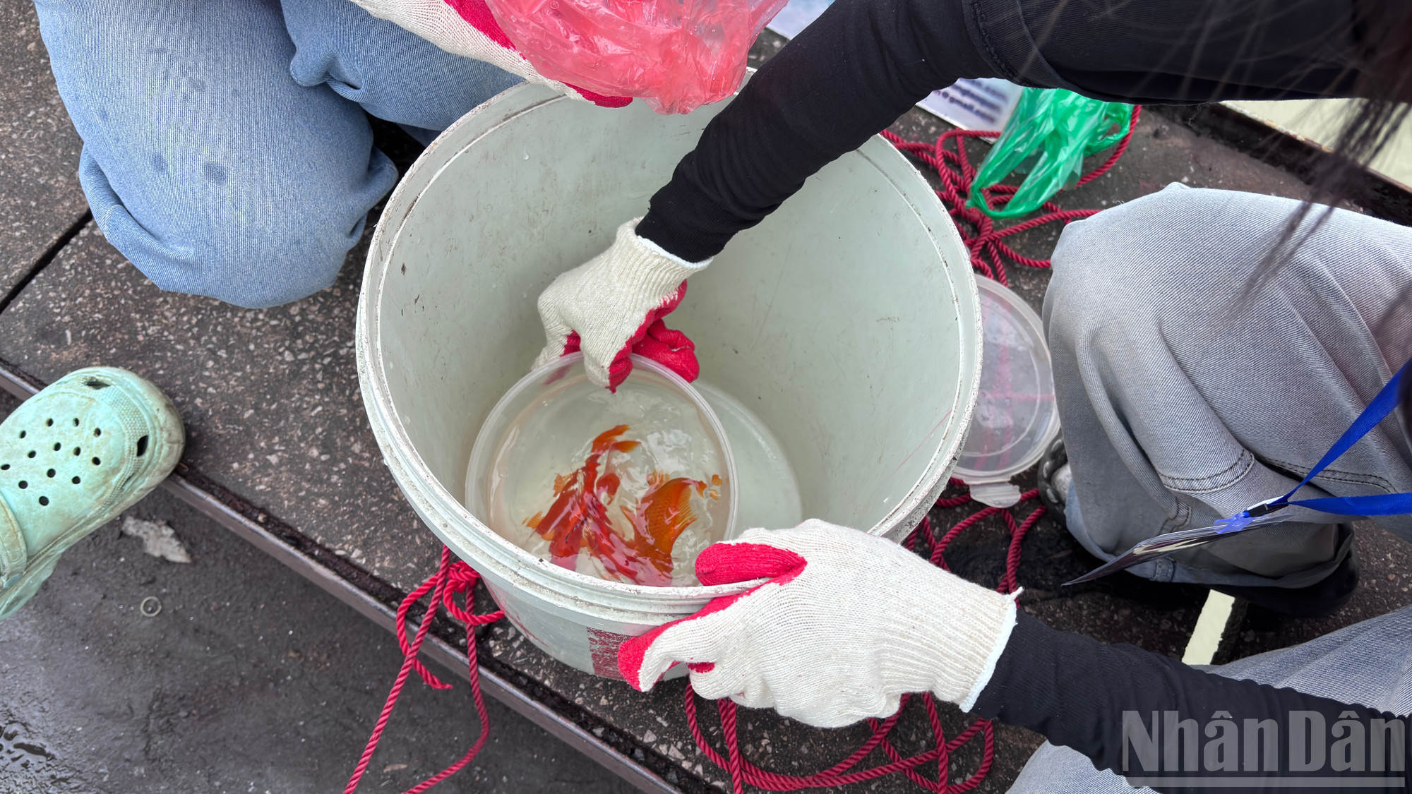 Các tình nguyện viên đã bố trí xô nhựa có kèm theo dây tời dài để hỗ trợ mọi người thả cá xuống sông Hồng.