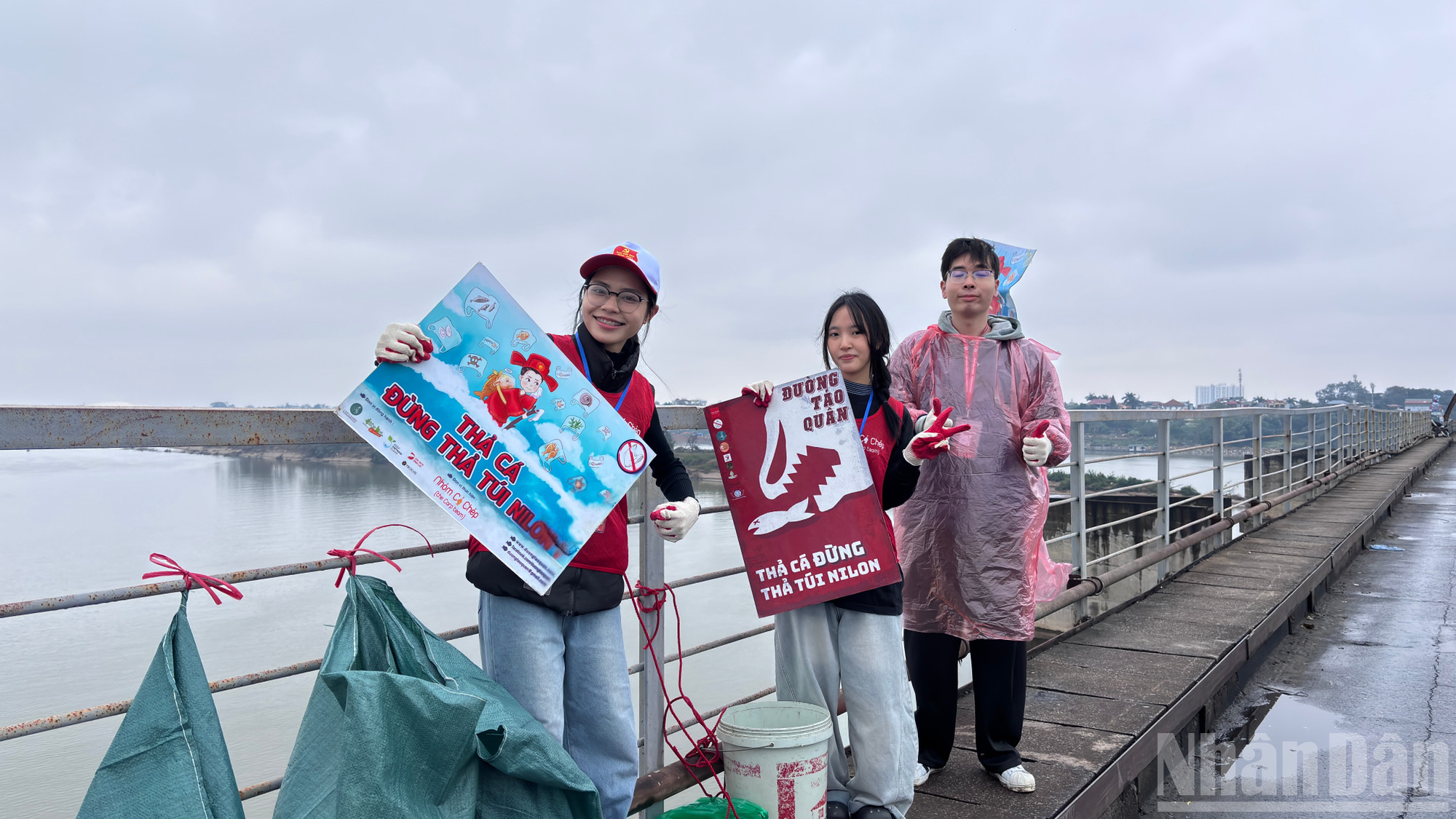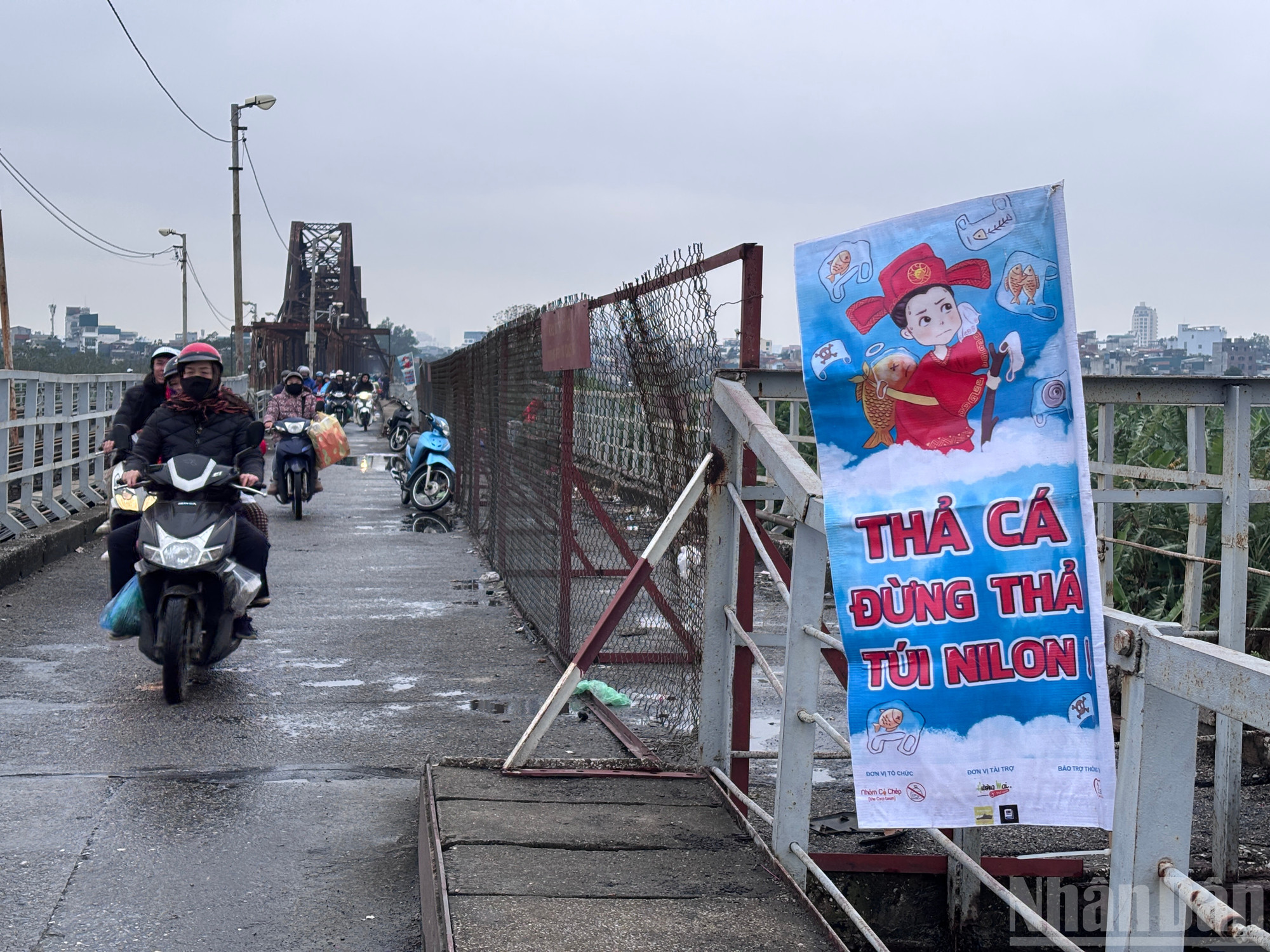 Tại khu vực cầu Long Biên, rất nhiều băng rôn khẩu hiệu với chủ đề "Thả cá đừng thả túi nilon" được treo trên cầu nhằm muốn nhắc người dân về ý thức bảo vệ môi trường sau khi thả cá.