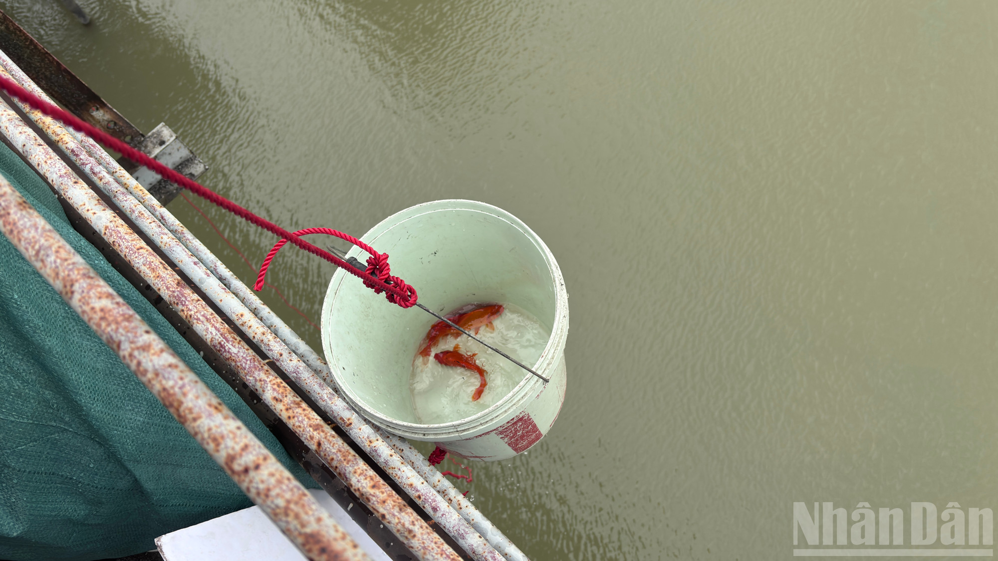 Với hệ thống dây đã được chuẩn bị sẵn, xô chứa cá ông Công, ông Táo sẽ được đưa xuống sát khu vực mặt nước.
