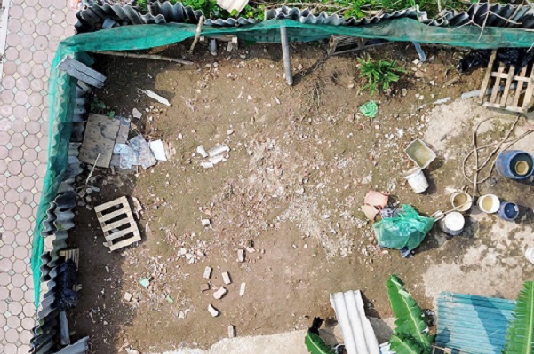 Qua quan sát, tại khu lán trại này, bên trong là khu đất trống chứa nhiều đồ đạc, thùng nhựa bừa bộn; phía sau là khu vực chăn nuôi lợn ẩm thấp, tối om. Càng tiến lại gần khu chuồng trại, mùi hôi thối từ phân lợn càng trở nên nồng nặc.