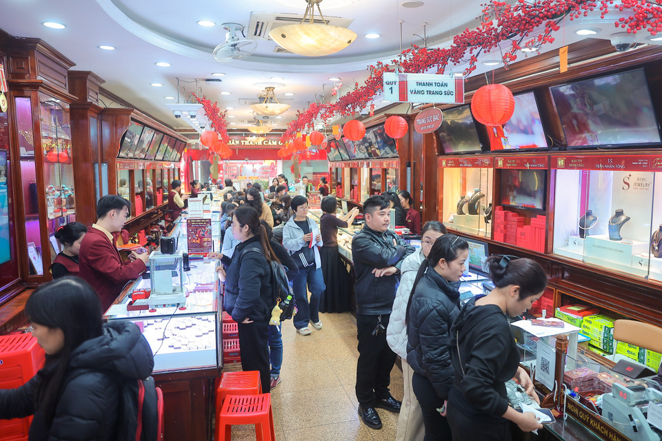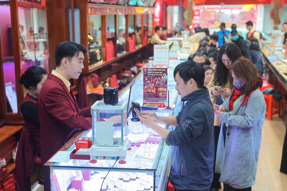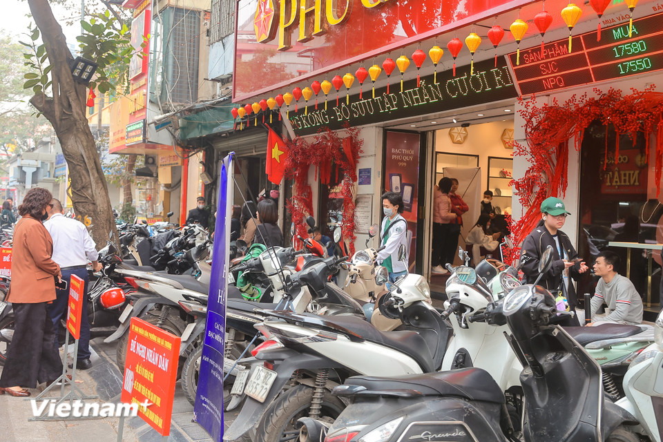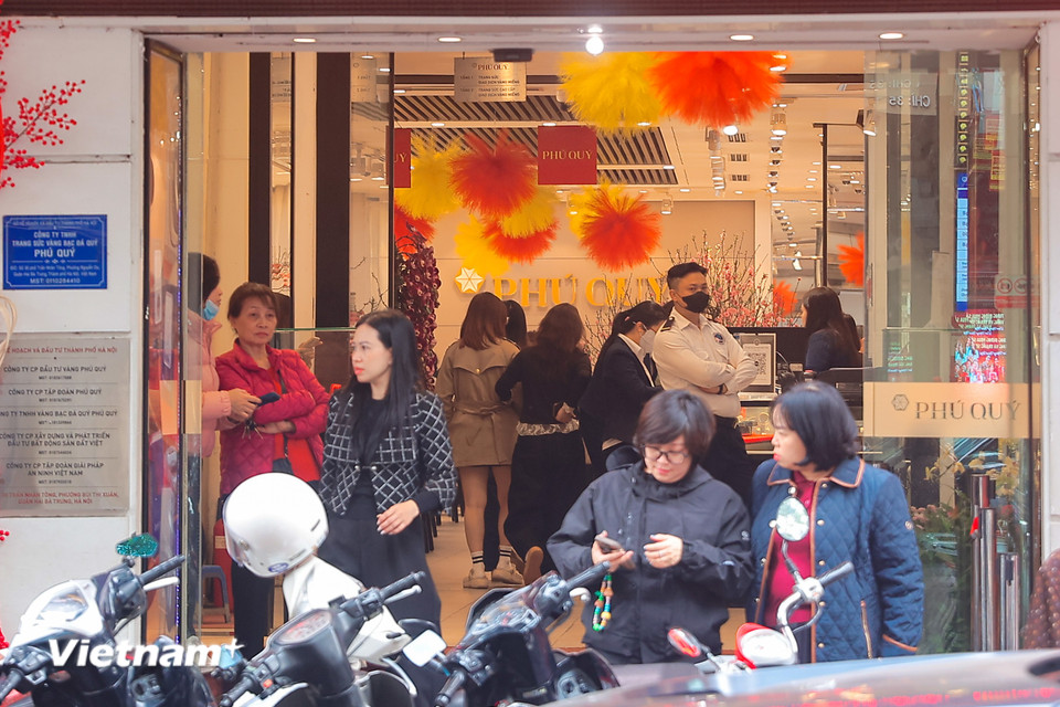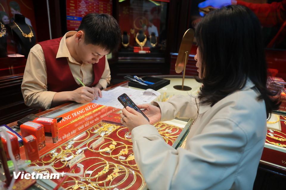 Ghi nhận tương tự tại cửa hàng vàng Phú Quý, người dân tấp nập giao dịch từ sáng đến chiều. (Ảnh: Hoài Nam/Vietnam+)