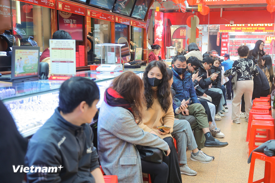 Ghi nhận của phóng viên tại các cửa hàng vàng trên phố Trần Nhân Tông, nhiều người dân xếp hàng từ sáng đến chiều để chờ tới lượt mua bán vàng. (Ảnh: Hoài Nam/Vietnam+)