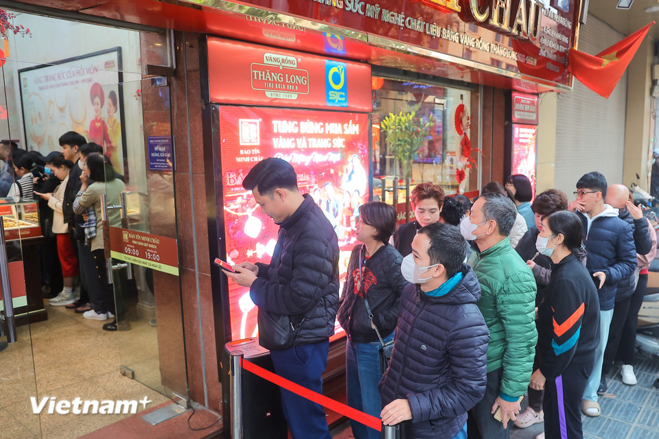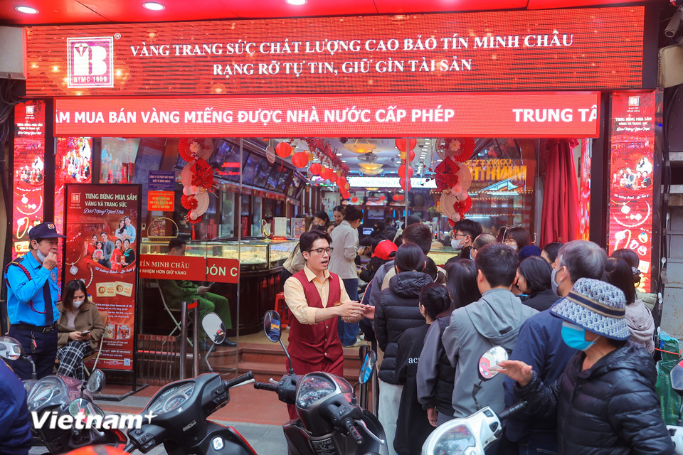 Tại cửa hàng vàng Bảo Tín Minh Châu ghi nhận số lượng người đến mua chiếm đa số, nên cửa hàng giới hạn số lượng bán để phục vụ được nhiều khách hàng. (Ảnh: Hoài Nam/Vietnam+)