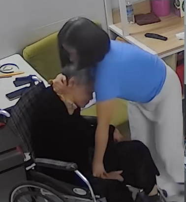 Camera ghi lại nhiều tình huống người này đưa tay tát vào vùng đầu cụ bà với biên độ rõ, theo hướng từ trên xuống hoặc ngang sang. Các động tác diễn ra nhanh, có quán tính, không giống thao tác chăm sóc, đỡ nâng thông thường đối với người cao tuổi. Sau mỗi tình huống, cụ bà vẫn ở nguyên vị trí, không tự điều chỉnh được tư thế hay di chuyển. Ngoài ra người này còn ghì đầu, dẫm lên chân cụ.