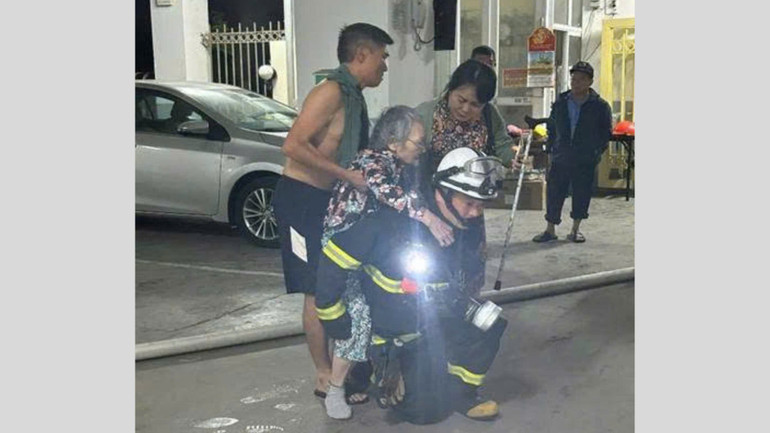 Lực lượng chức năng cứu hộ an toàn một người cao tuổi.