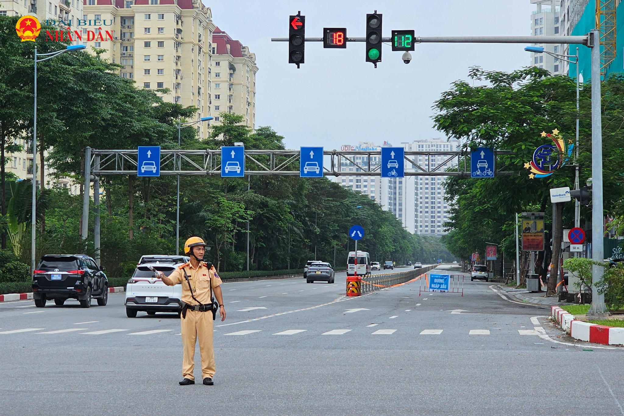 Lực lượng Cảnh sát giao thông số 2 (Phòng CSGT Công an TP Hà Nội) ứng trực tại điểm ngập trên đường Võ Chí Công phân luồng, hướng dẫn các phương tiện di chuyển tránh khu vực ngập nước