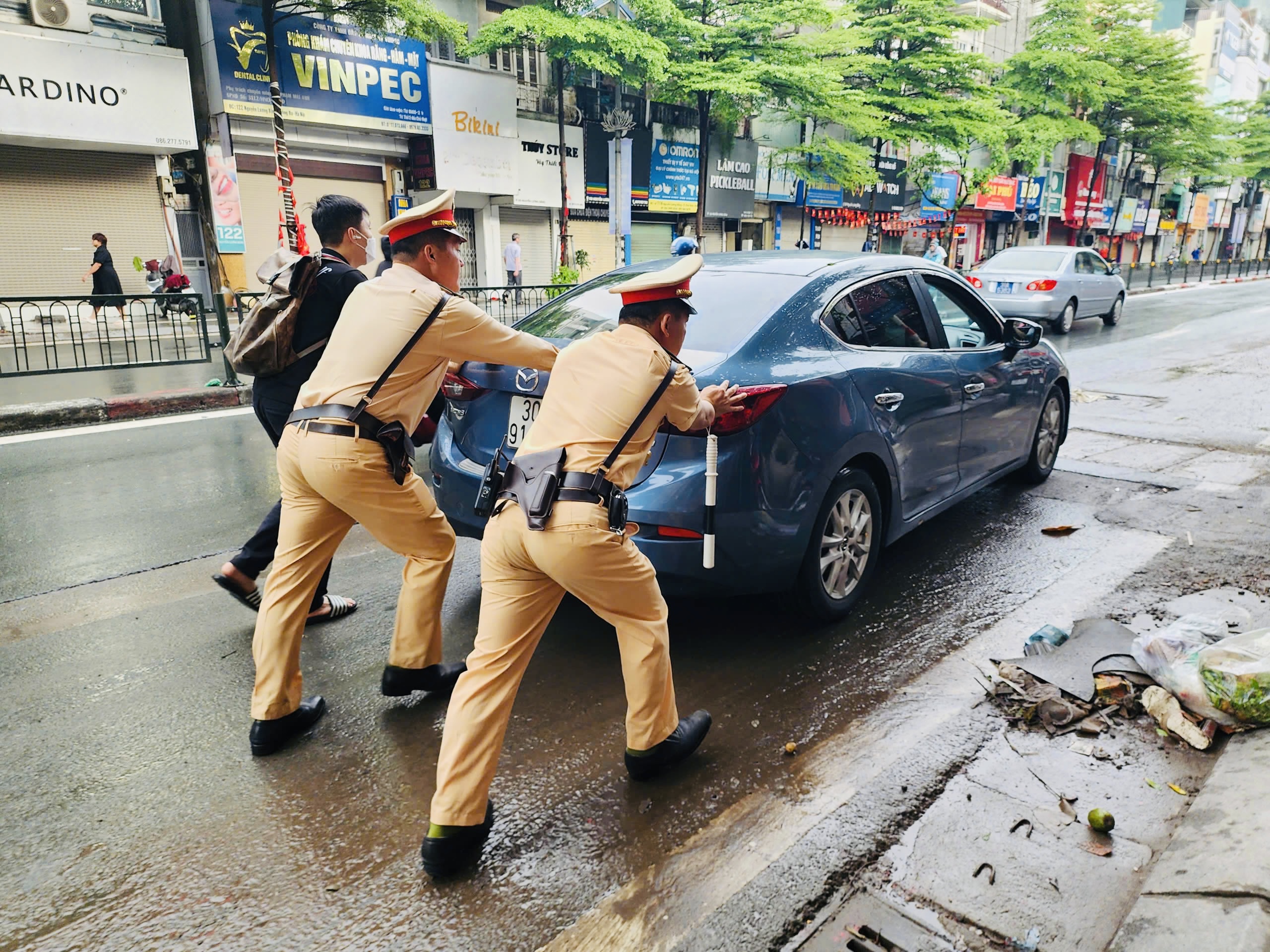 Mưa ngớt nhưng nước từ các tuyến cao hơn vẫn chảy về, khiến đường Nguyễn Chí Thanh đoạn qua cổng Đài Truyền hình Việt Nam vẫn ngập tương đối sâu, gây ùn tắc giao thông.