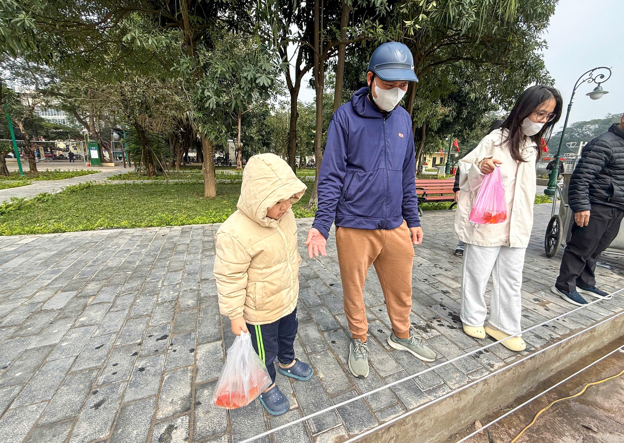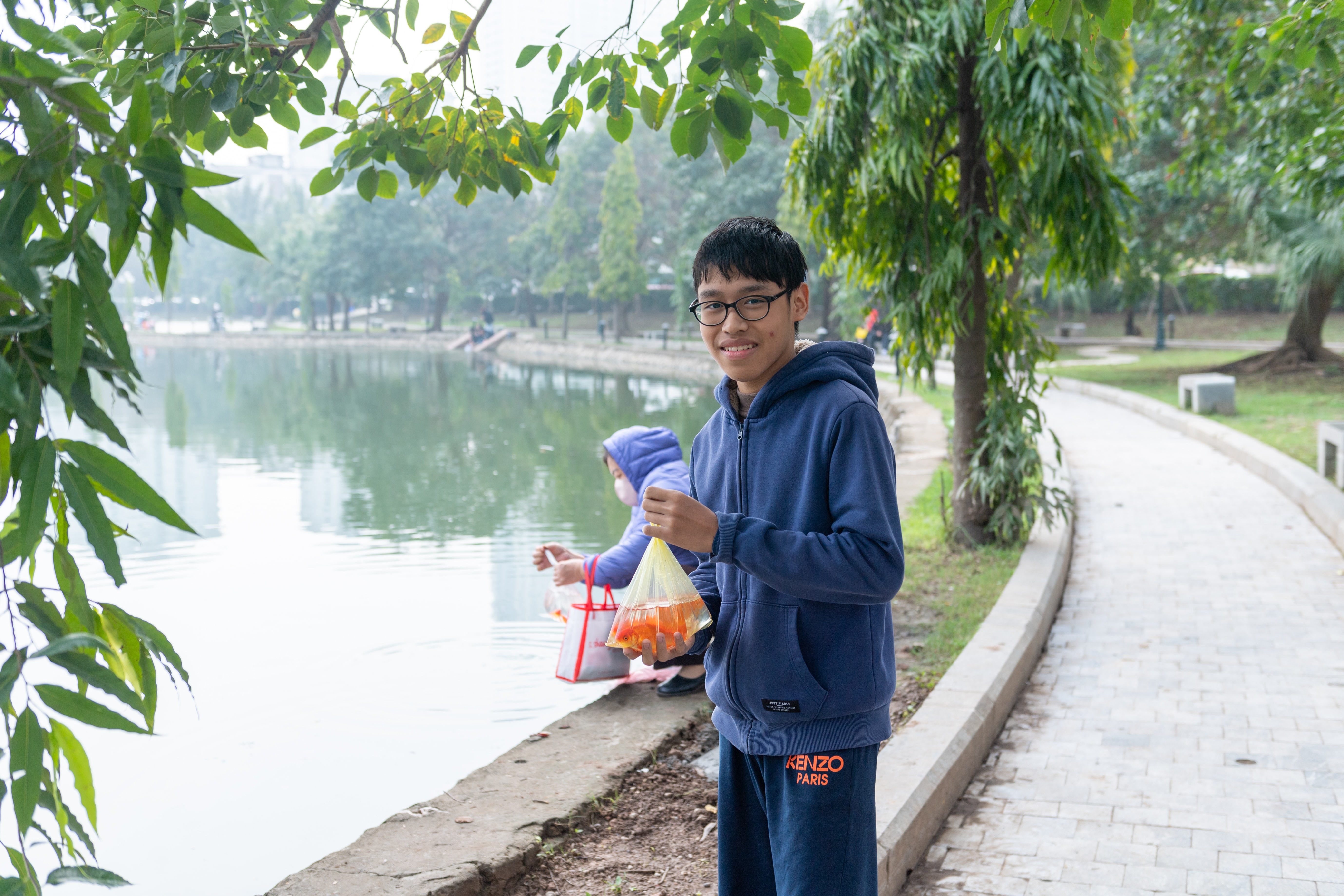 Em T chia sẻ, được bố mẹ giao cho nhiệm vụ đi thả cá chép tiễn ông Công, ông Táo, em cảm thấy rất vui và hào hứng vì được tham gia phong tục truyền thống của gia đình trong những ngày giáp Tết. Ảnh: Mạnh Hưng