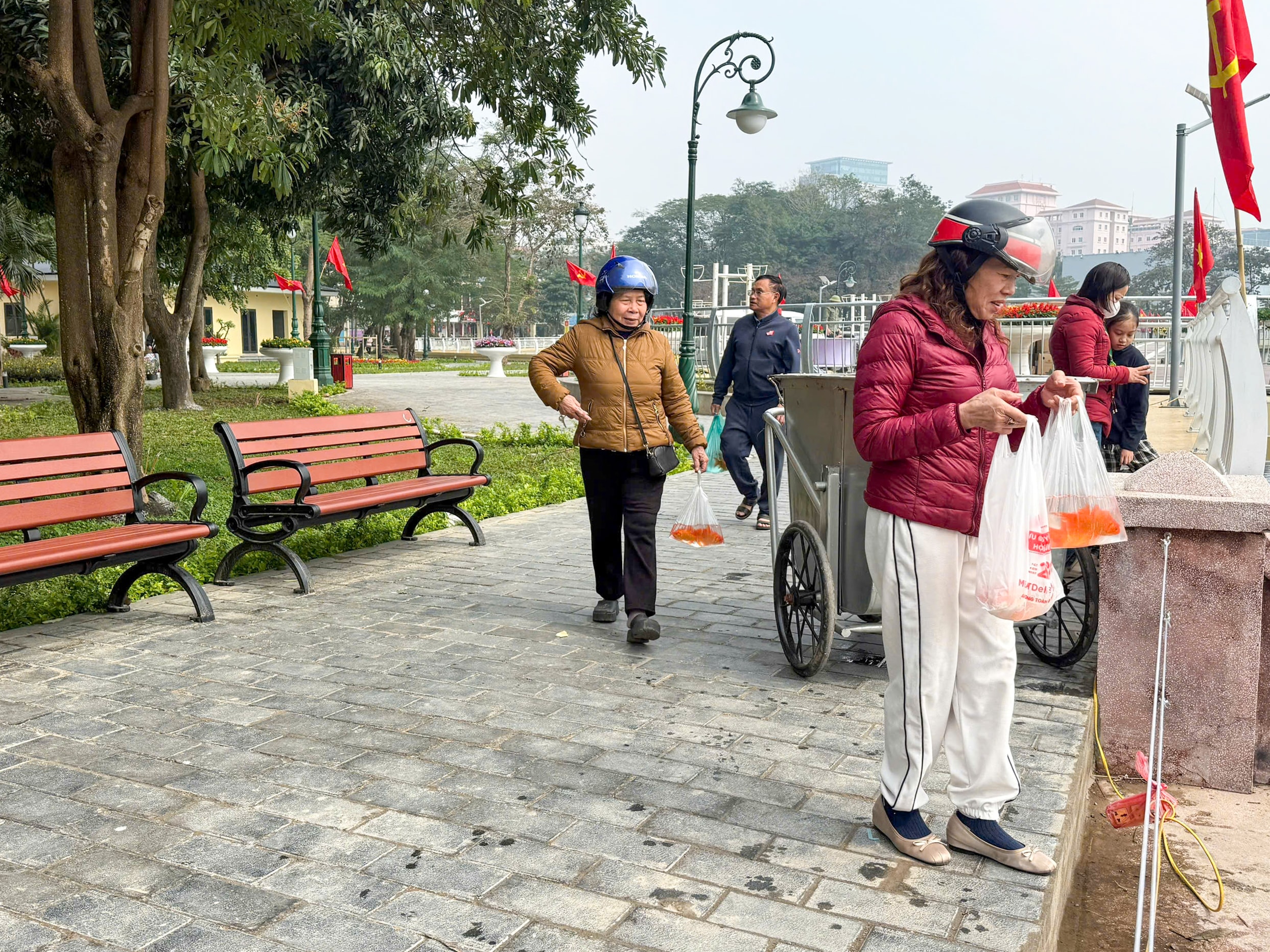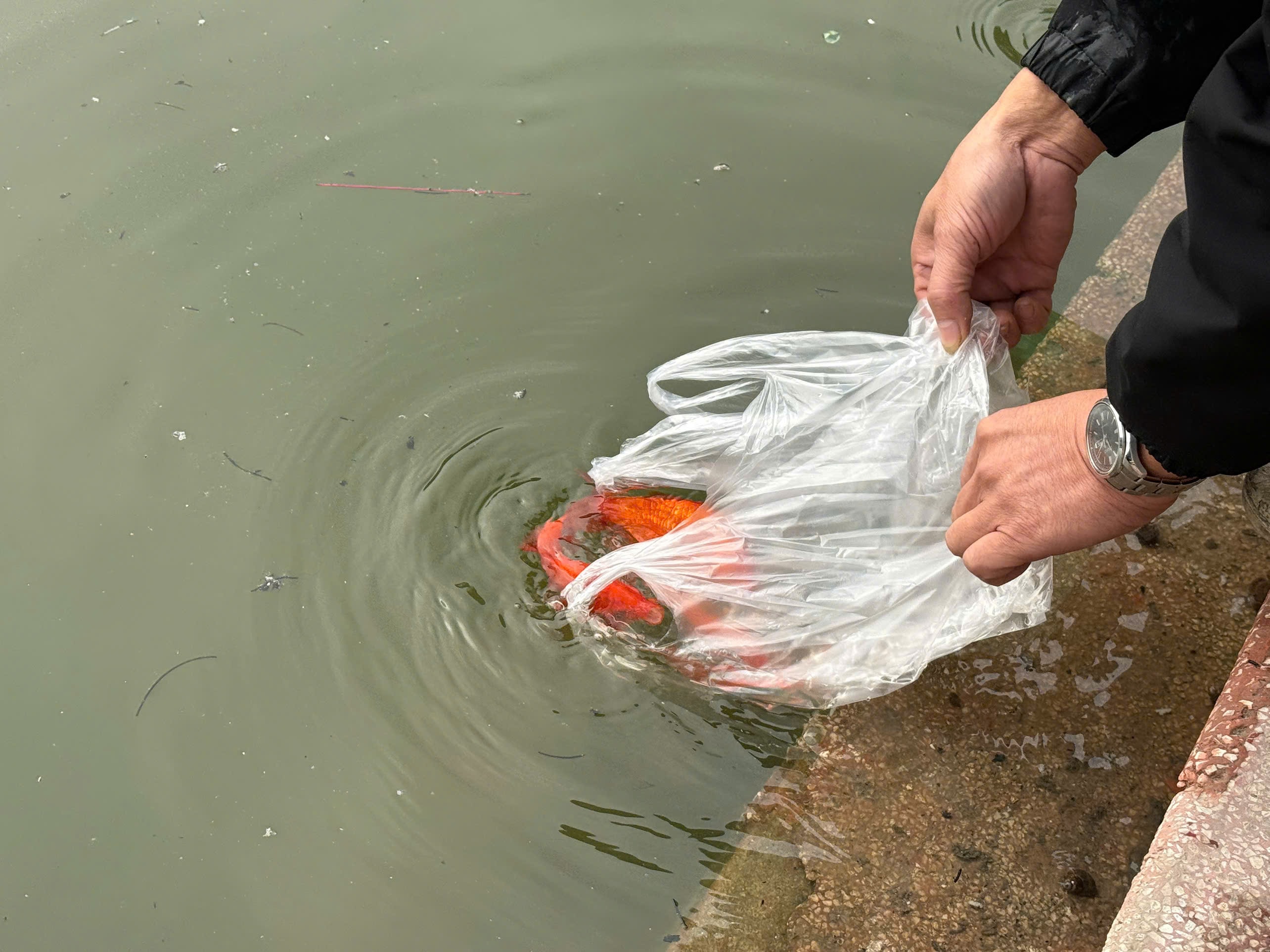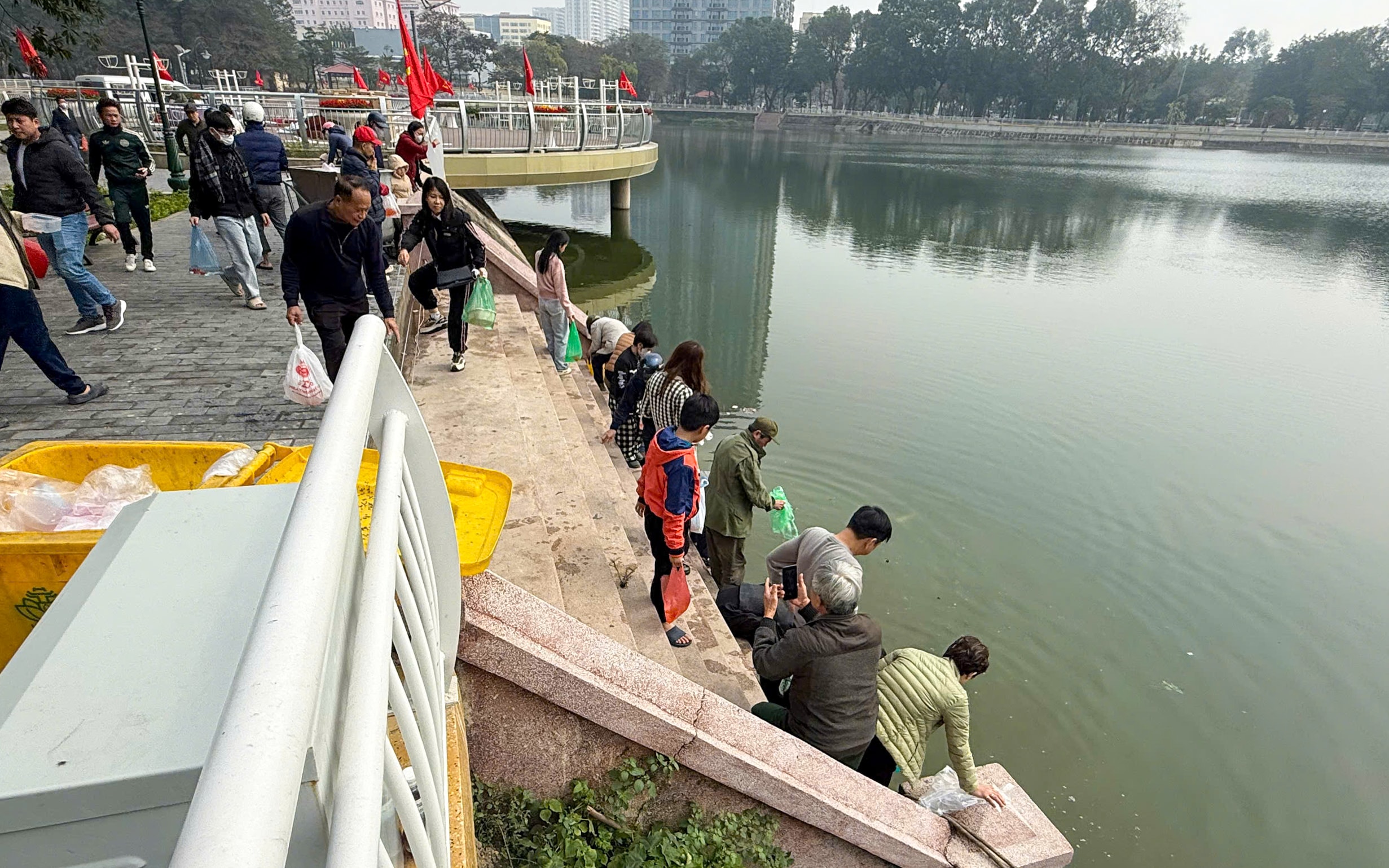 Người dân thành kính thả cá xuống hồ sau khi hoàn tất lễ cúng tại nhà, hoạt động diễn ra trật tự, góp phần giữ gìn cảnh quan và môi trường.