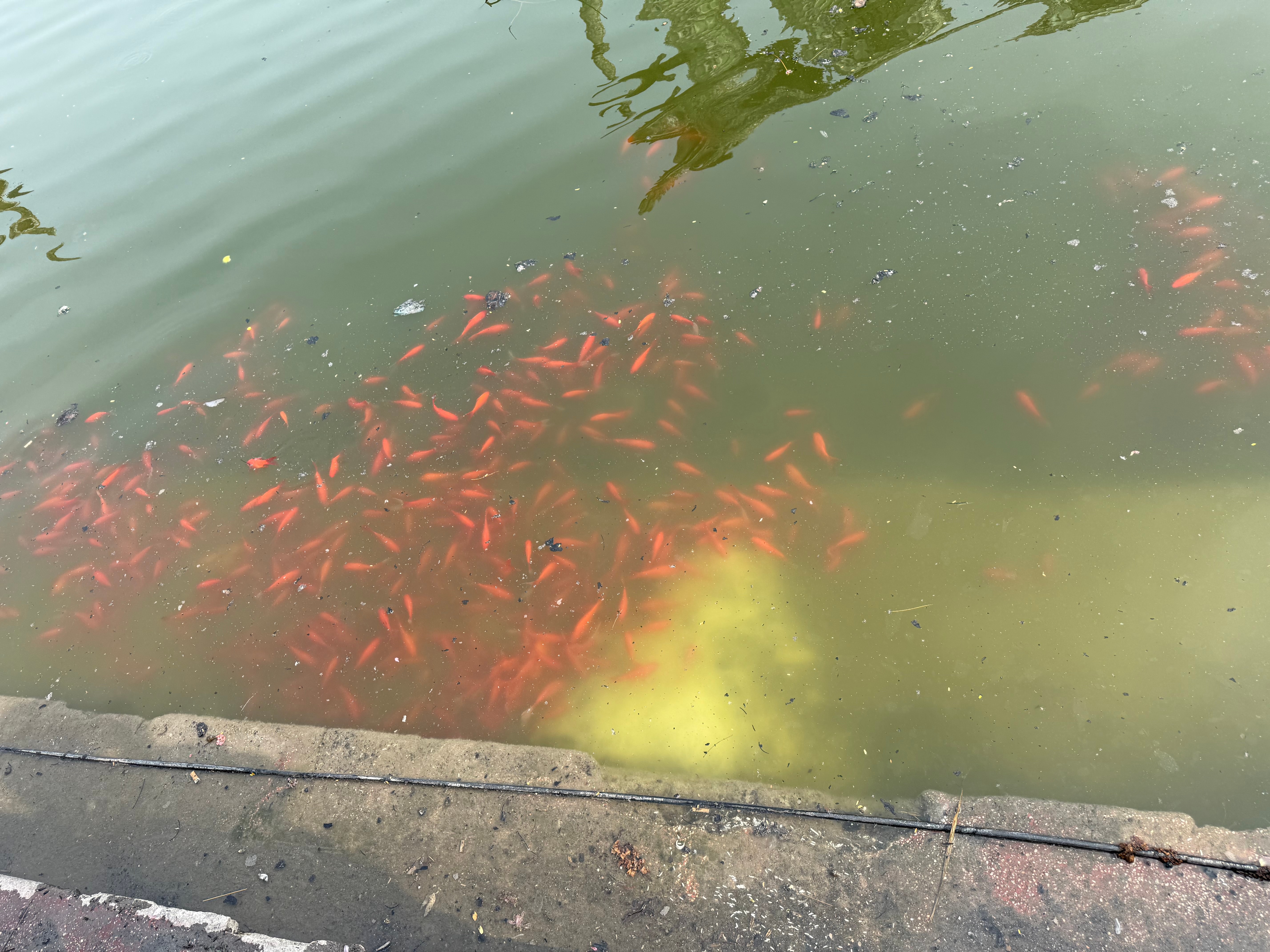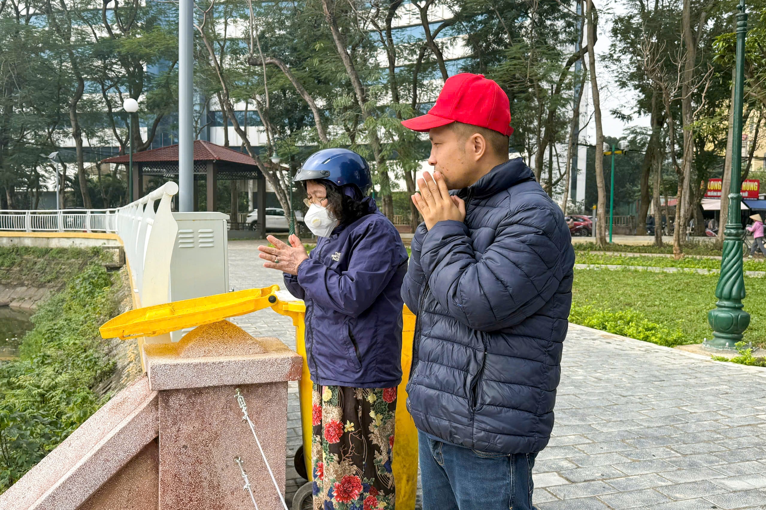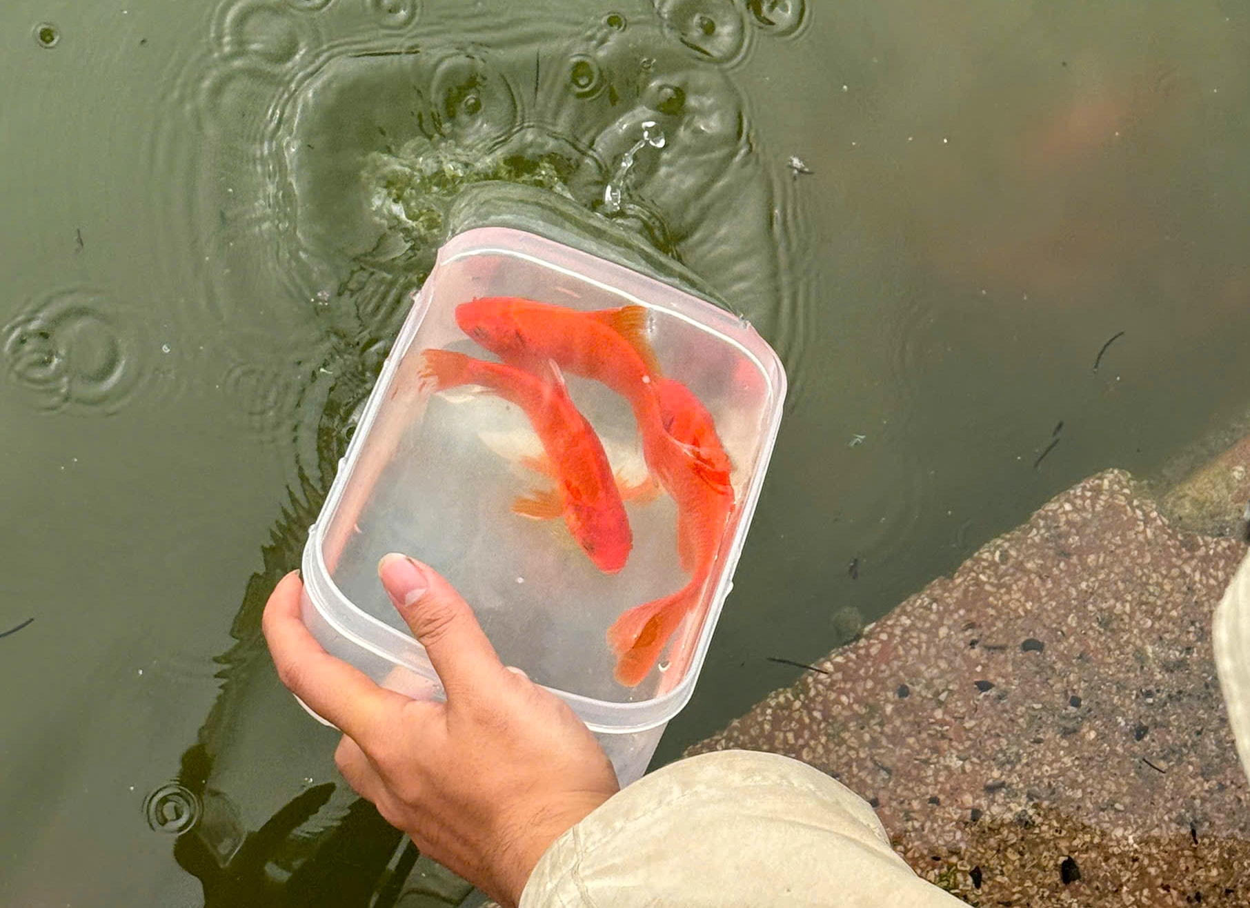 Người dân thành kính thả cá xuống hồ sau khi hoàn tất lễ cúng tại nhà, hoạt động diễn ra trật tự, góp phần giữ gìn cảnh quan và môi trường.