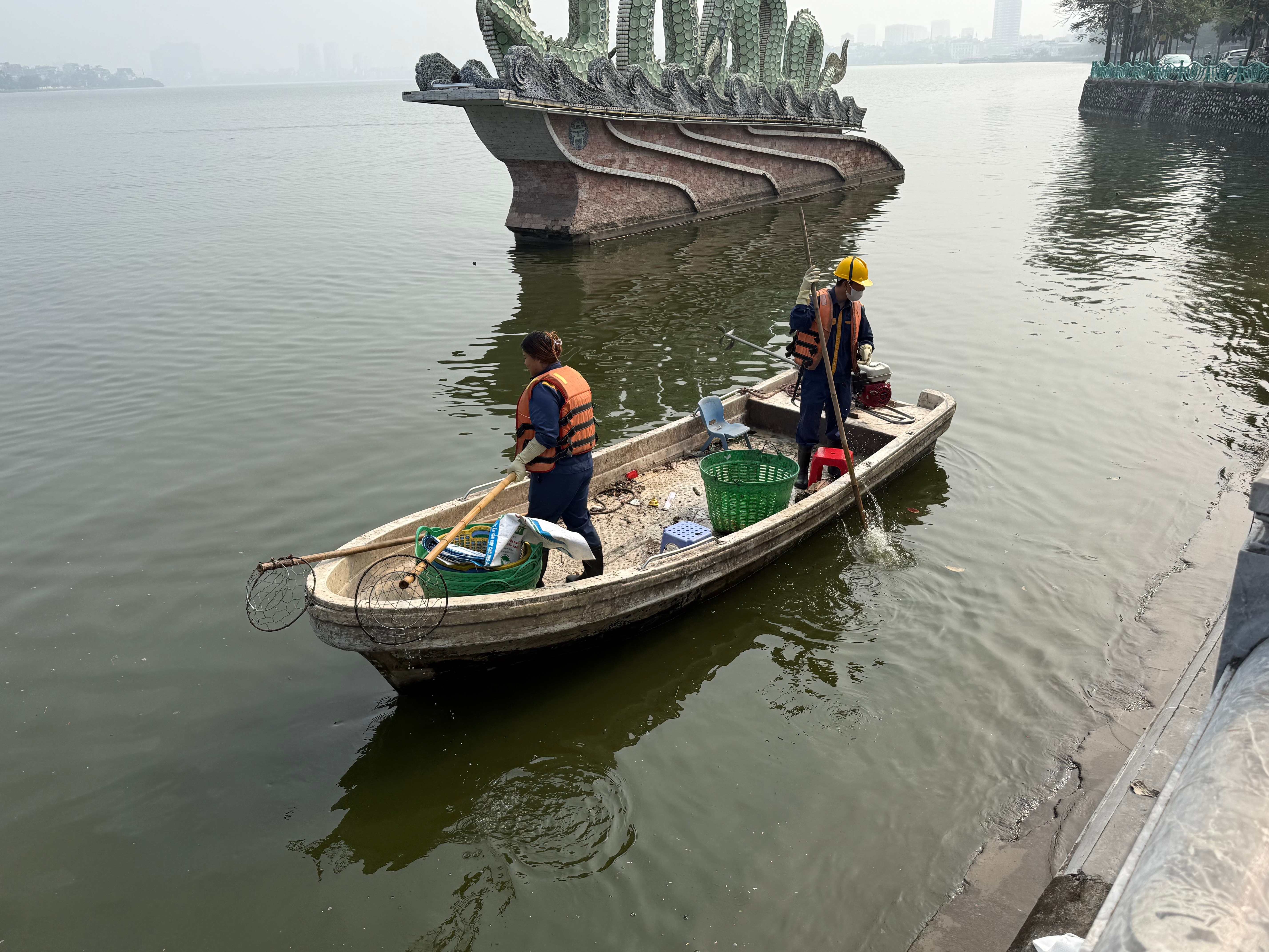 Vớt rác, làm sạch mặt nước Hồ Tây sau khi thả cá. Ảnh: Mạnh Hưng