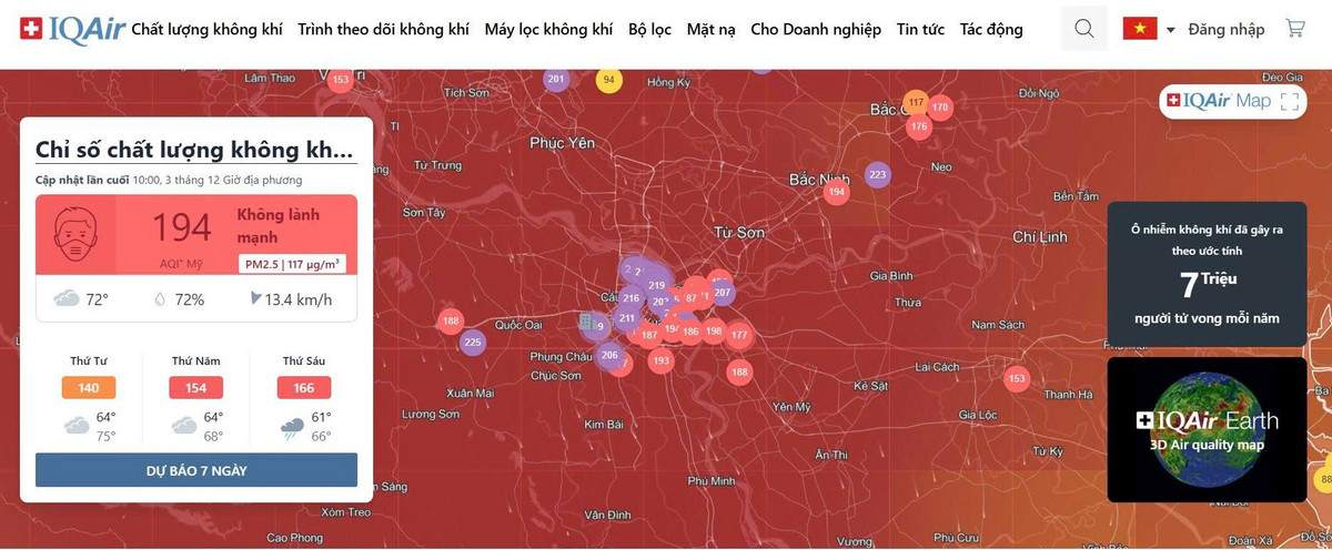 Dữ liệu trên IQAir sáng 3/12 cũng ghi nhận nhiều khu vực ở Hà Nội cảnh báo mức tím - mức “rất có hại cho sức khỏe”. Hà Nội cũng đang được trang này xếp thứ 4 trong 10 thành phố ô nhiễm nhất thế giới, chỉ số 208 ở mức tím.