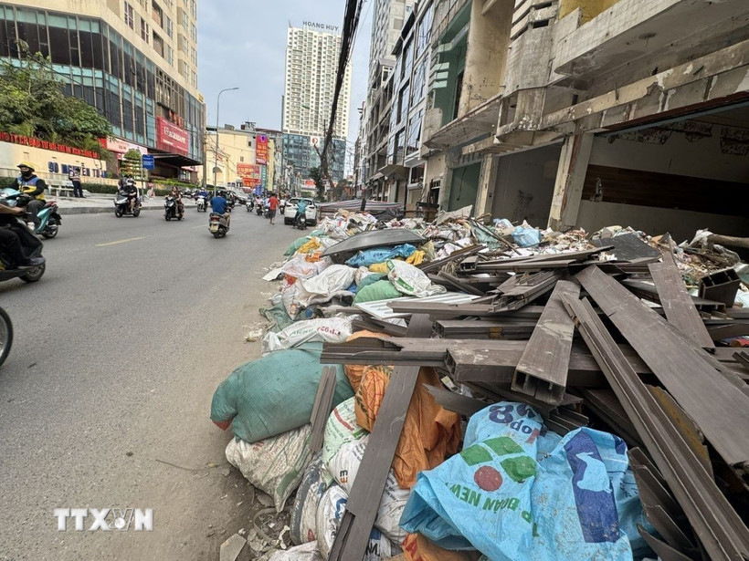 Rác thải tràn ngập ra đường, gây nguy hiểm cho người tham gia giao thông và ô nhiễm môi trường. (Ảnh: Quốc Lũy/TTXVN)