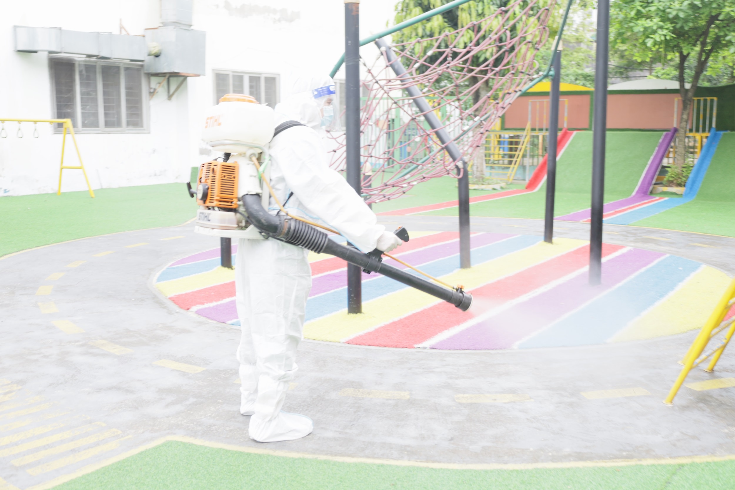 Thực hiện công tác khử khuẩn, vệ sinh môi trường. Ảnh: Hà Thu