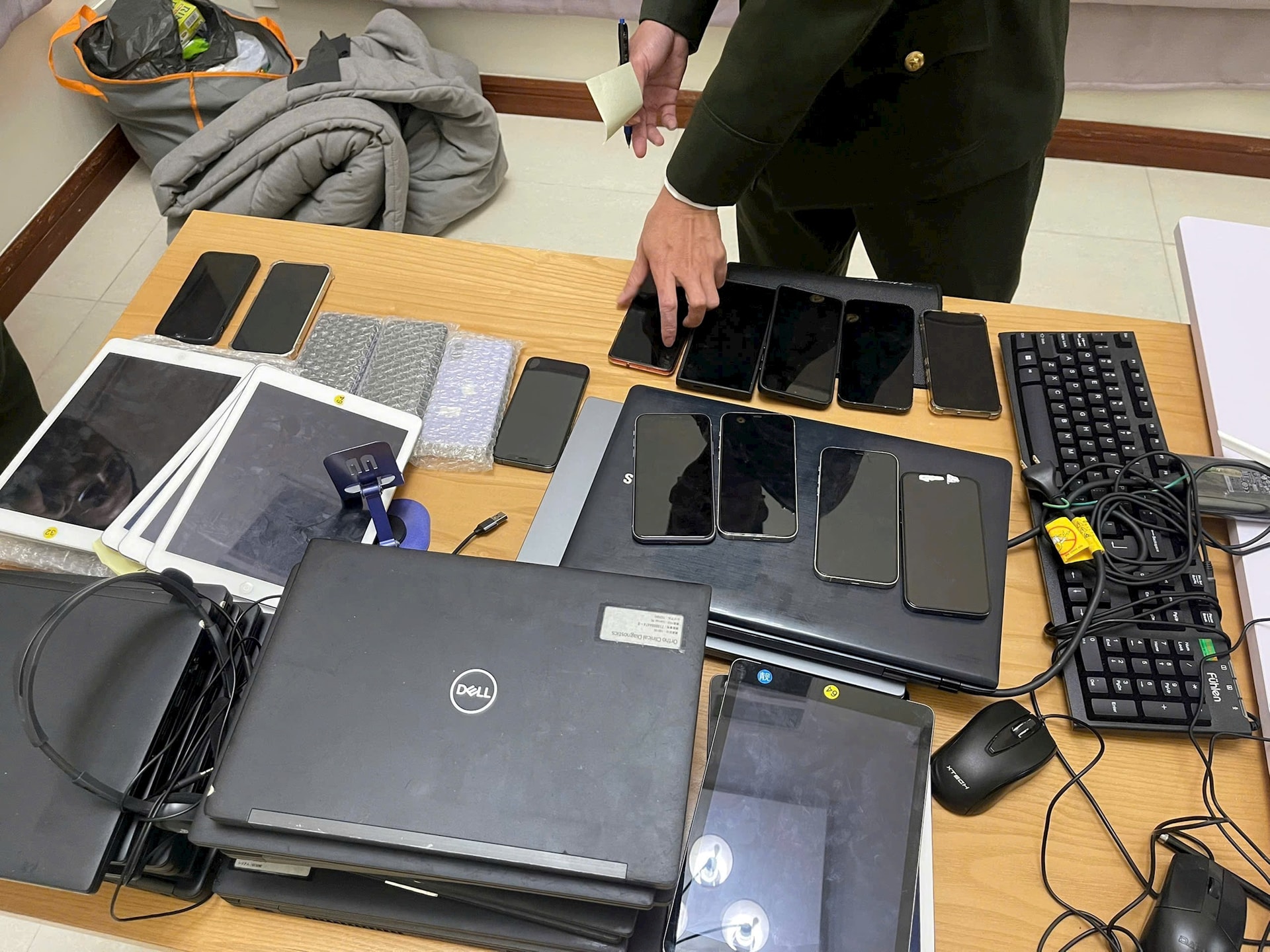 Cơ quan Công an đã thu giữ số lượng lớn thiết bị điện tử, gồm hàng chục máy tính xách tay, máy tính bảng và điện thoại di động để phục vụ công tác điều tra, xác minh.