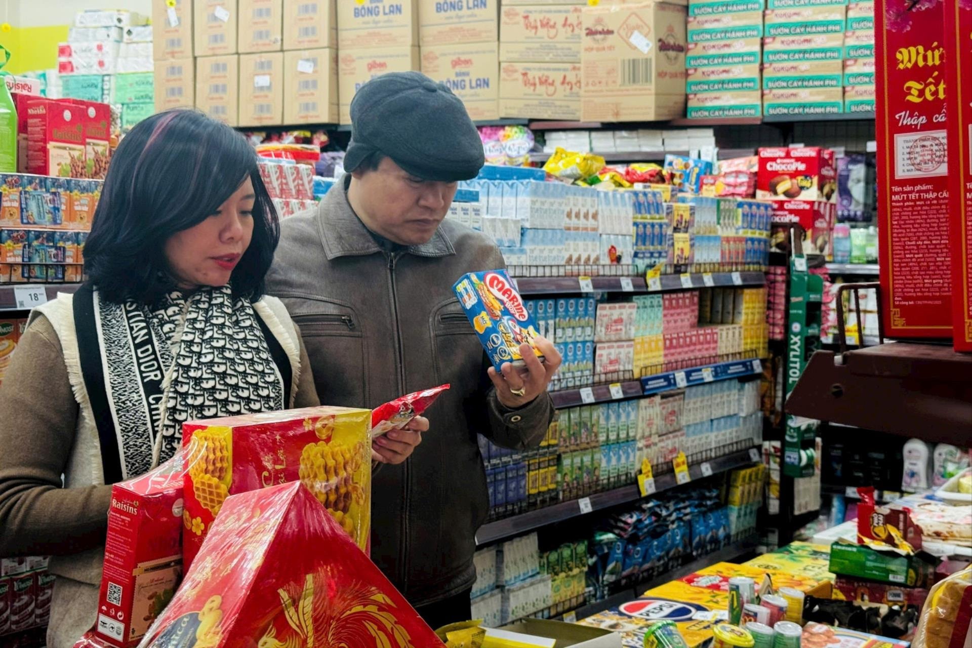 Các thành viên đoàn kiểm tra liên ngành số 01 về ATTP của thành phố kiểm tra nhãn mác, hạn sử dụng của sản phẩm. Ảnh: Mai Hoa