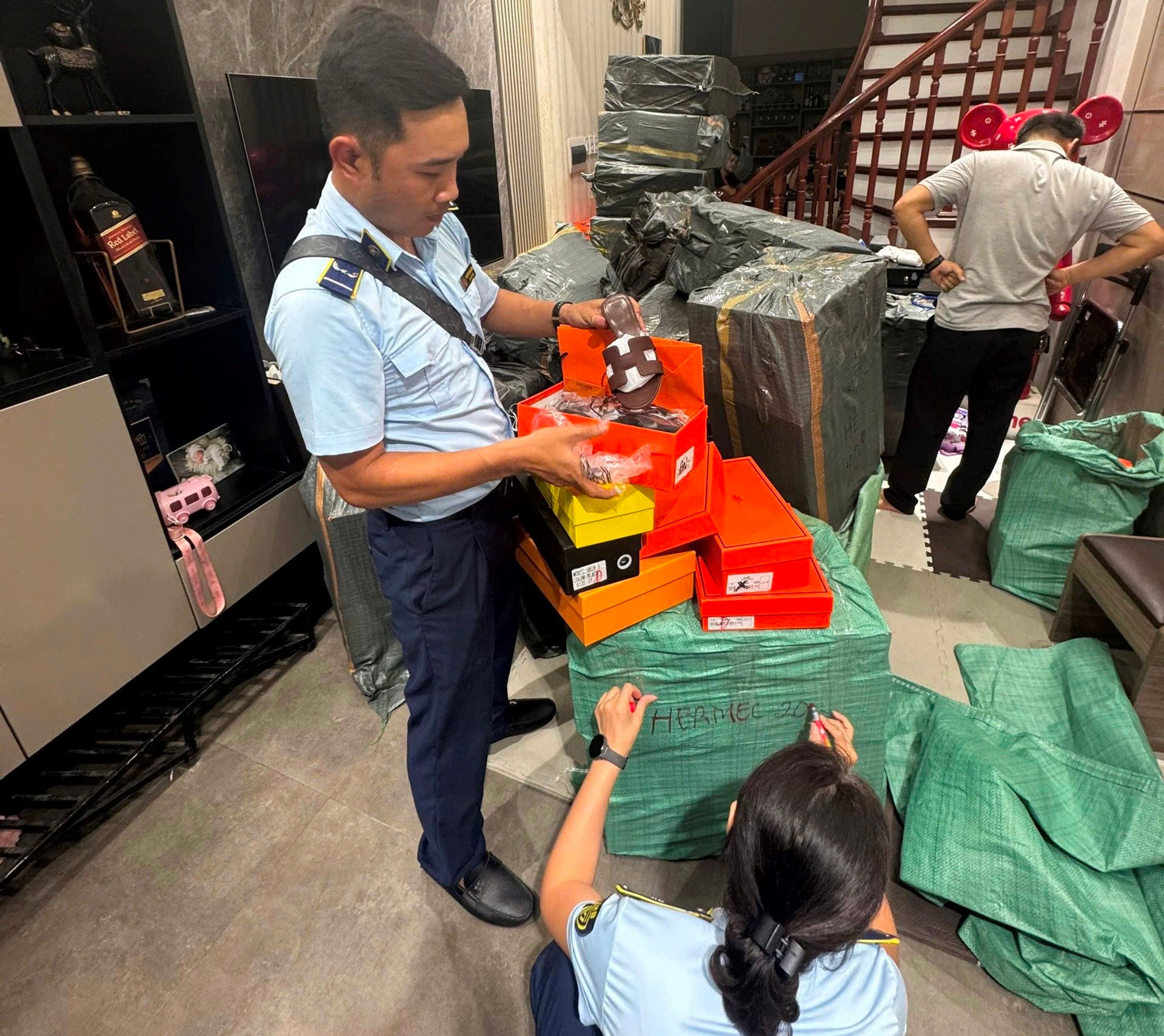 Cụ thể, trong số hàng hóa bị tạm giữ của bà Vũ Thị Kim Cúc có: 3.478 đôi dép giả mạo nhãn hiệu Hermes; 620 sản phẩm giày dép giả mạo nhãn hiệu Dior; 310 đôi dép giả mạo nhãn hiệu Zara; 304 đôi dép giả mạo nhãn hiệu Saint Laurent (YSL); 49 đôi dép giả mạo nhãn hiệu Gucci; 36 đôi giày giả mạo nhãn hiệu MLB; 347 đôi dép giả mạo nhãn hiệu Louis Vuitton; 393 sản phẩm giày dép giả mạo nhãn hiệu Chanel; 30 đôi dép giả mạo nhãn hiệu Valentino; 97 đôi dép giả mạo nhãn hiệu Adidas.