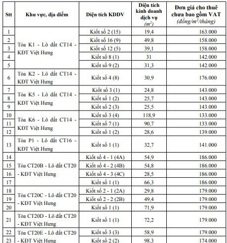 Theo Quyết định, phê duyệt đơn giá cho thuê diện tích kinh doanh dịch vụ 09 tòa nhà chung cư thương mại tại khu đô thị Việt Hưng thuộc tài sản công của Thành phố giao cho Trung tâm Quản lý nhà thành phố Hà Nội quản lý gồm: Tòa K1 - Lô đất CT14; Tòa K2 - Lô đất CT14; Tòa K5 - Lô đất CT14; Tòa K6 - Lô đất CT14; Tòa P1 - Lô đất CT16; Tòa CT20B - Lô đất CT20; Tòa CT20C - Lô đất CT20; Tòa CT20D - Lô đất CT20; Tòa CT20E - Lô đất CT20.