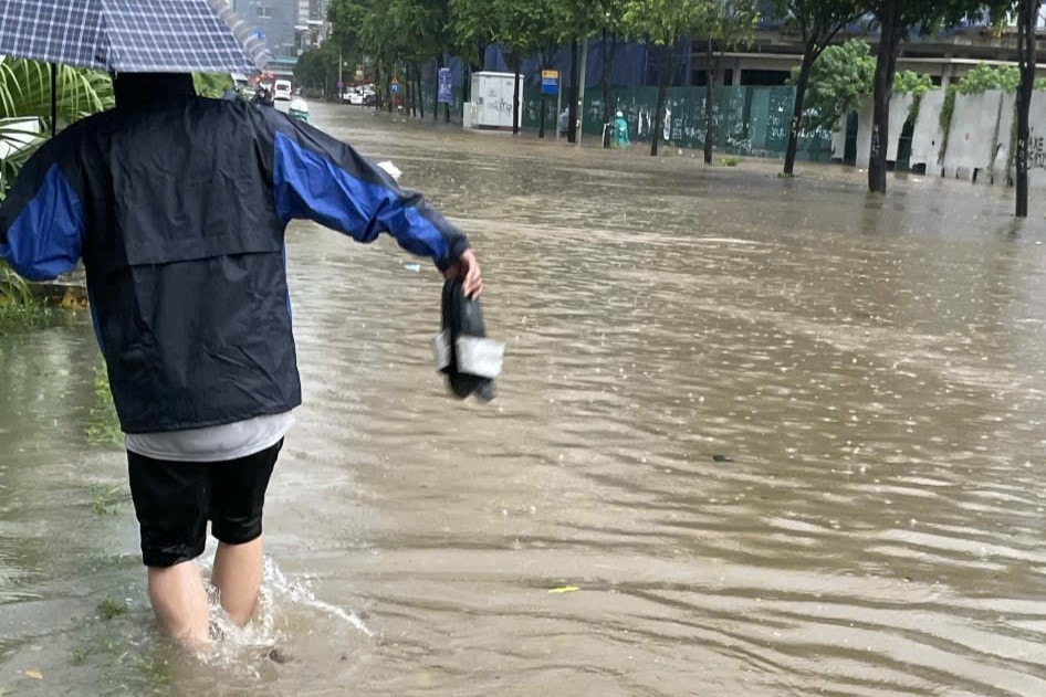 Khu vực Nguyễn Xiển ngập sâu, giao thông đi lại khó khăn. Ảnh: Mạnh Hưng