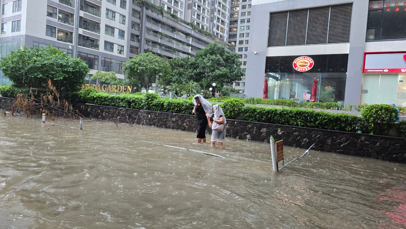 Khu vực đường Nguyễn Xiển - Phạm Hùng cũng bị ngập sâu. Đường vành đai 3 trên cao và đường dẫn đoạn trước UBND phường Thanh Xuân ùn tắc.
